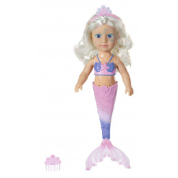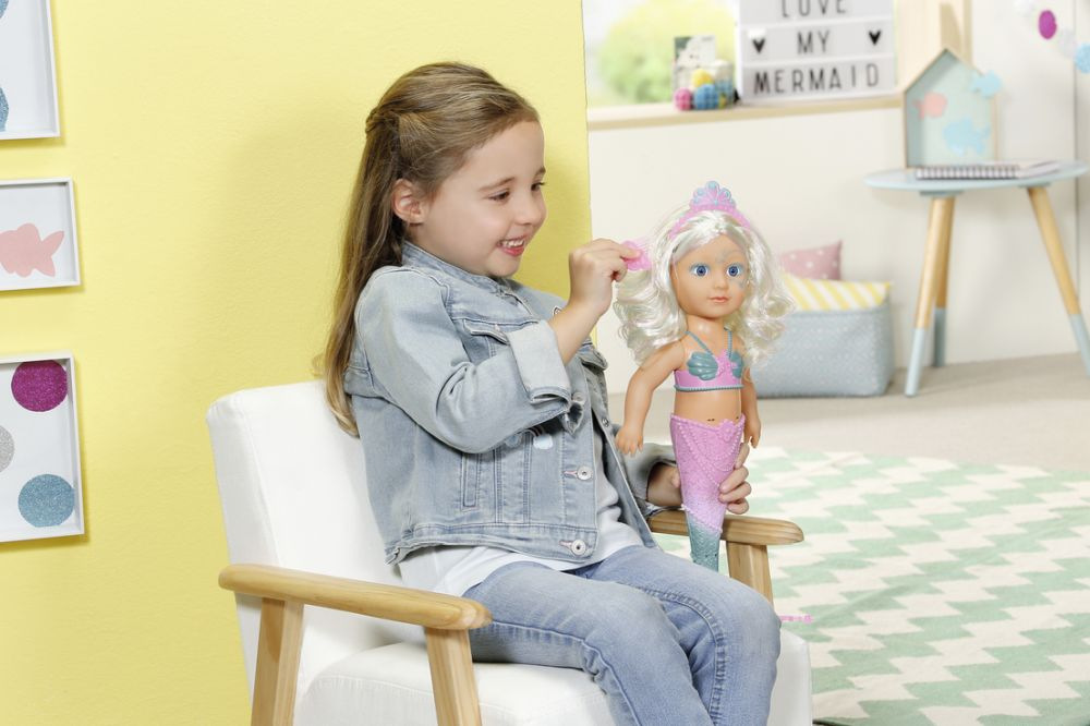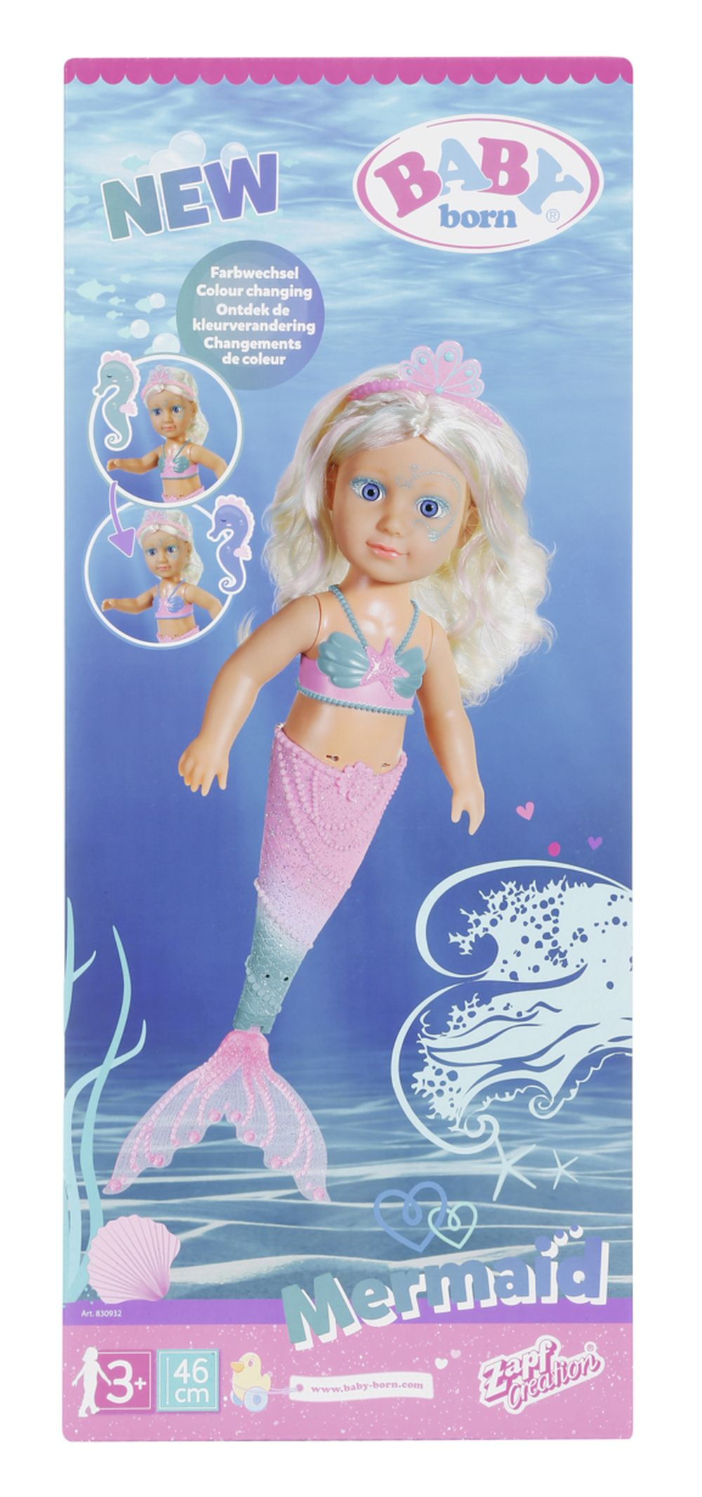 Meerjungfrauen sind geheimnisvolle Wesen und BABY born Meerjungfrau ist da keine Ausnahme. Im Wasser schwingt sie mit ihrer bunten Flosse und schwimmt elegant. Sobald es mit kaltem Wasser in Kontakt kommt, ändert sich die Farbe des Anzugs: von Rosa zu Türkis und von Türkis zu Blau. Wie macht er das nur? In den langen blonden Haaren hat sie bunte Strähnchen. Ihr Haar ist mit einem Stirnband geschmückt. Im Lieferumfang ist auch ein rosa Kamm enthalten, der beim Erstellen schöner Frisuren hilft. • BABY born Meerjungfrau. • Im Wasser bewegt es die Flosse. • Mit Farbeffektänderung. • Das vielfältige „Rollenspiel“ mit der BABY born Puppe regt die Fantasie an und es wurde nachgewiesen, dass es die Entwicklung sozialer Fähigkeiten und Werte wie Verantwortung, Kommunikation und Empathie fördert. • Funktioniert mit Batterien. BABY born Meerjungfrau, 46 cm. Ein Kamm und ein Stirnband sind enthalten.