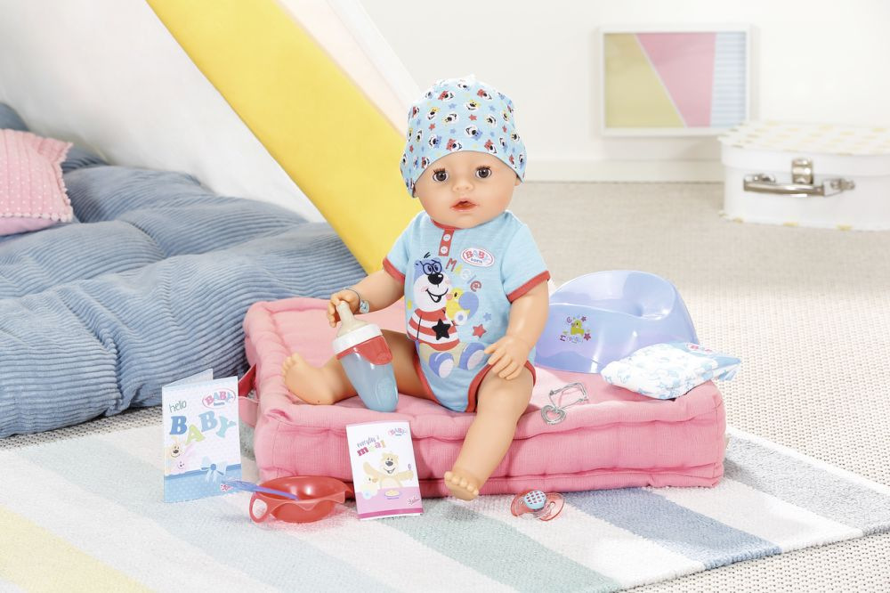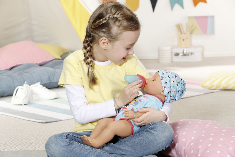BABY born Baby Boy schläft, isst und badet am liebsten. Er liebt es, Wasser aus seiner Flasche zu trinken. Dann pinkelt sie in ihre Windel oder aufs Töpfchen und vergießt dabei echte Puppentränen. So wie BABY born Wasser trinken kann, kann sie auch Brei essen. Und er kann sogar kacken. Arme, Beine und Kopf der Puppe sind leicht beweglich, sodass das Umziehen zum Kinderspiel wird und großen Spaß macht. Der Puppenkörper aus „Soft Touch“-Material ist wunderbar weich und angenehm.