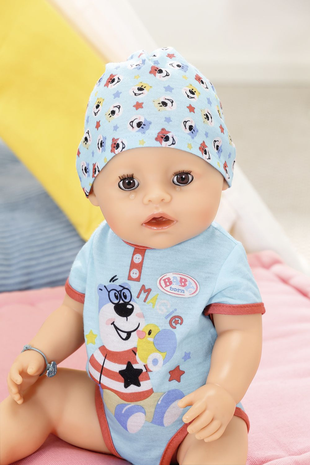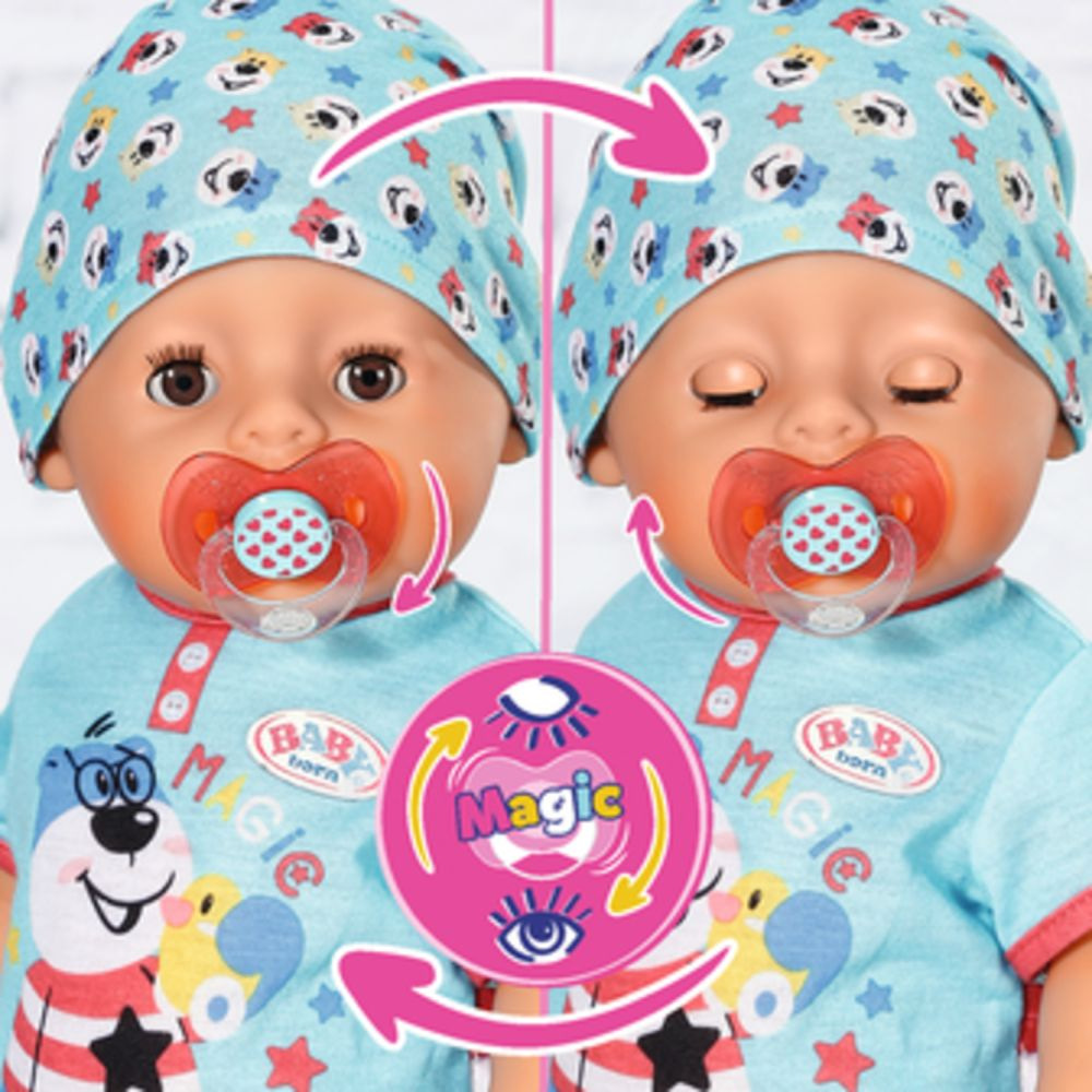 BABY Born Puppe mit magischem Schnuller, Junge, 43 cm, mit Body und Mütze. Im Paket enthalten sind ein Töpfchen, eine Windel, ein Teller mit Löffel, eine Portion Brei, ein Fläschchen, ein Zauberschnuller, eine Geburtsurkunde für die Puppe und Freundschaftsbänder für die Puppe und ihre kleine Mama.