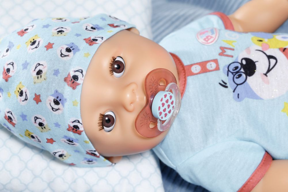 Durch Drehen des Schnullers öffnen und schließen sich die Augen der Puppe, egal in welcher Position sich der Puppenkörper befindet. Die Augen der Puppe blinzeln auch. Wenn BABY born Baby Boy auf dem Rücken liegt und keinen Schnuller im Mund hat, schließen sich seine Augen automatisch.