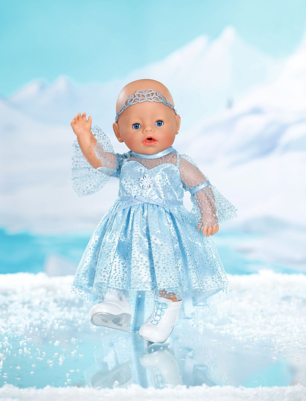 BABY born ve třpytivých šatech pro ledové princezny nejde přehlédnout. V krásných bruslích snadno klouže po zamrzlém jezeře s Teddym a Carlou. K šatům patří i diadém, který skvěle drží na hlavě během všech piruet.