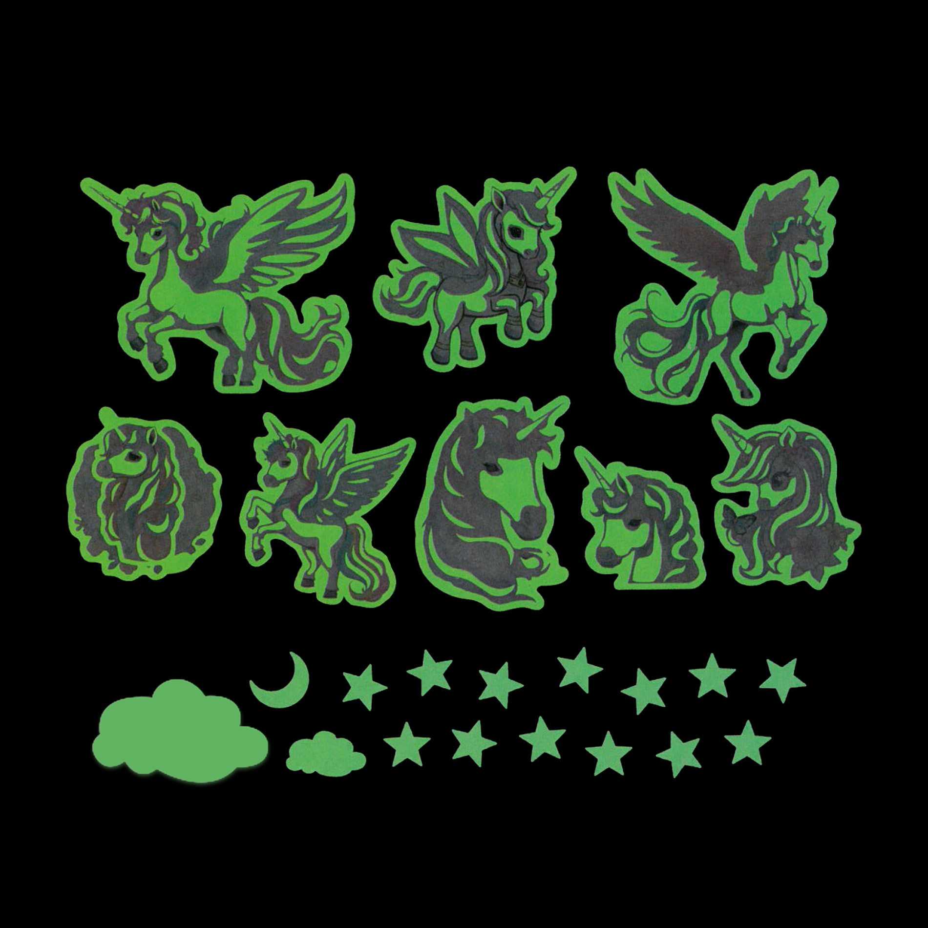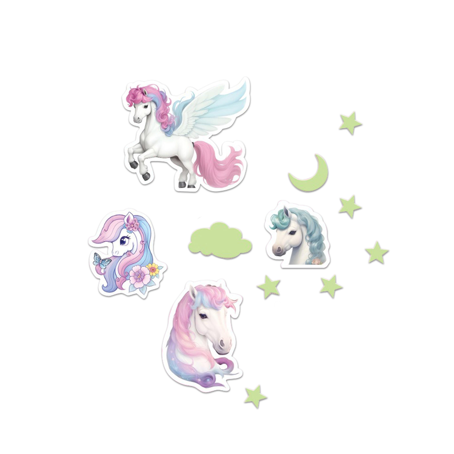 Barevná dekorace jednorožci na stěnu, nebo na nábytek. Po zhasnutí svítí ve tmě. Stačí nalepit a usínání bude hračka!
