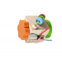 Montessori kostka, obasahujíc několik variant drobných činností k procvičení motorických schopností dítěte. Vhodné pro děti od 18m. Velikost hračky 70x70x70mm. Upevněno na paírové kartě
