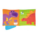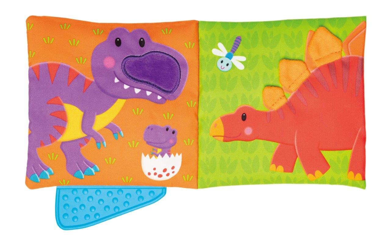Na přední straně naleznete pískací hlavu dinosaura pro ještě větší zábavu vašeho dítěte. Každá stránka je vyplněna speciální šustící hmotou a navíc na ní naleznete aktivní prvek, který vydává chrastící zvuky. Knížka je ideální pro podpoření hmatových, zrakových i zvukových vjemů dítěte. Hračka je měkká, bezpečná a je možné ji prát v pračce. Knížka obsahuje i kousátko k usnadnění prořezání zubů.
