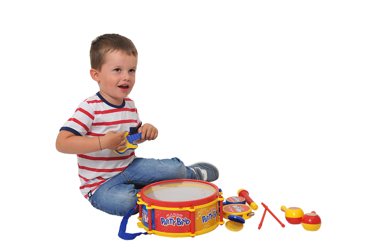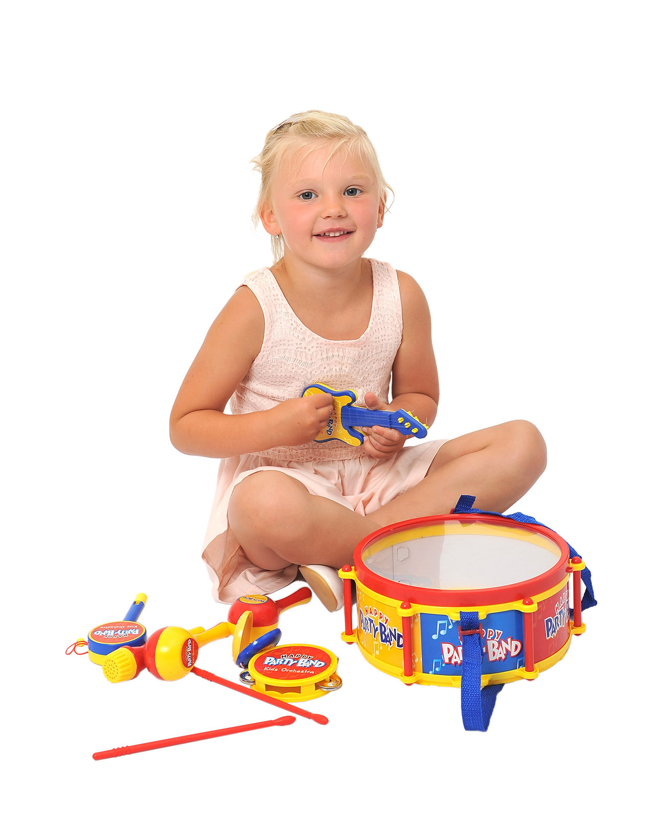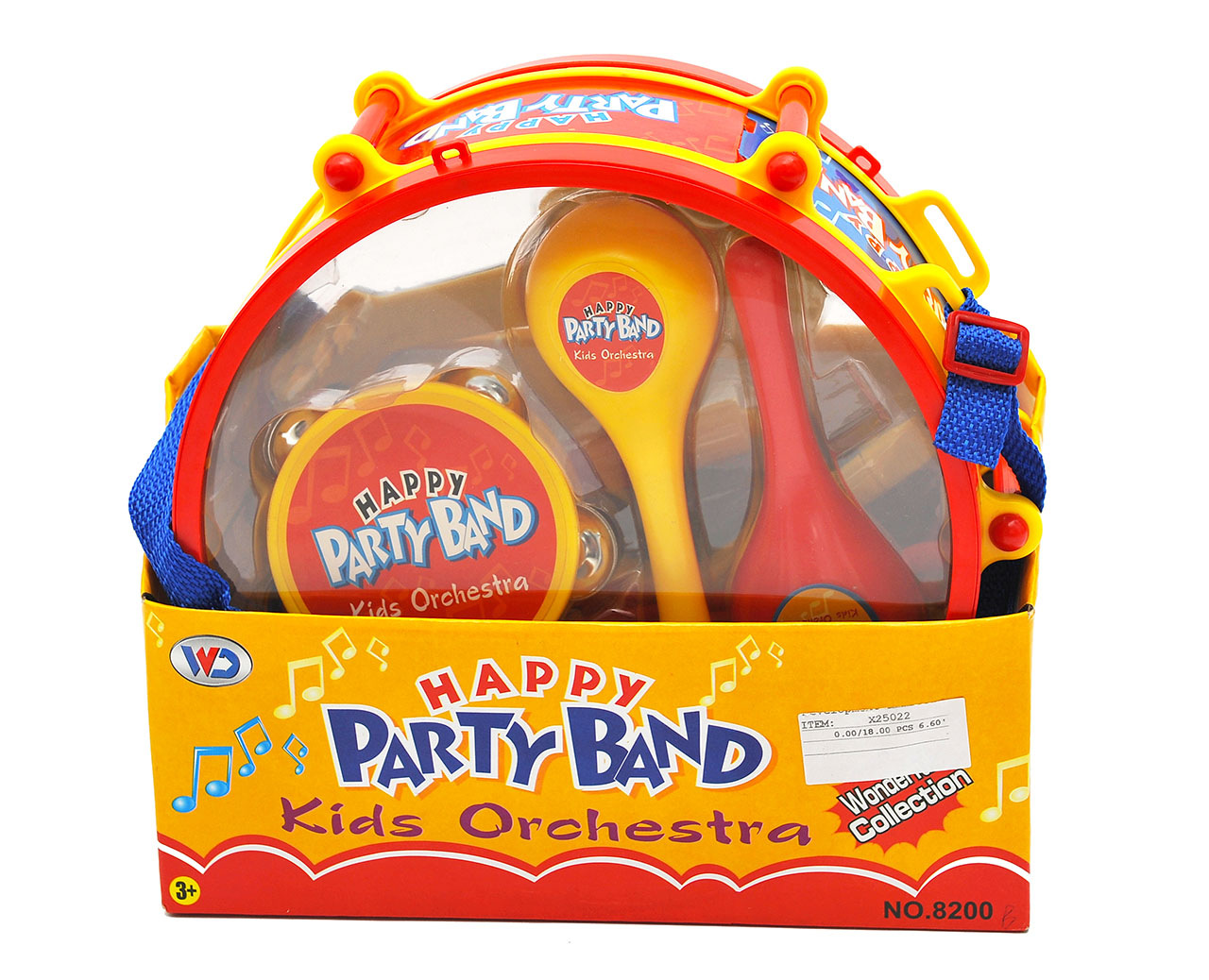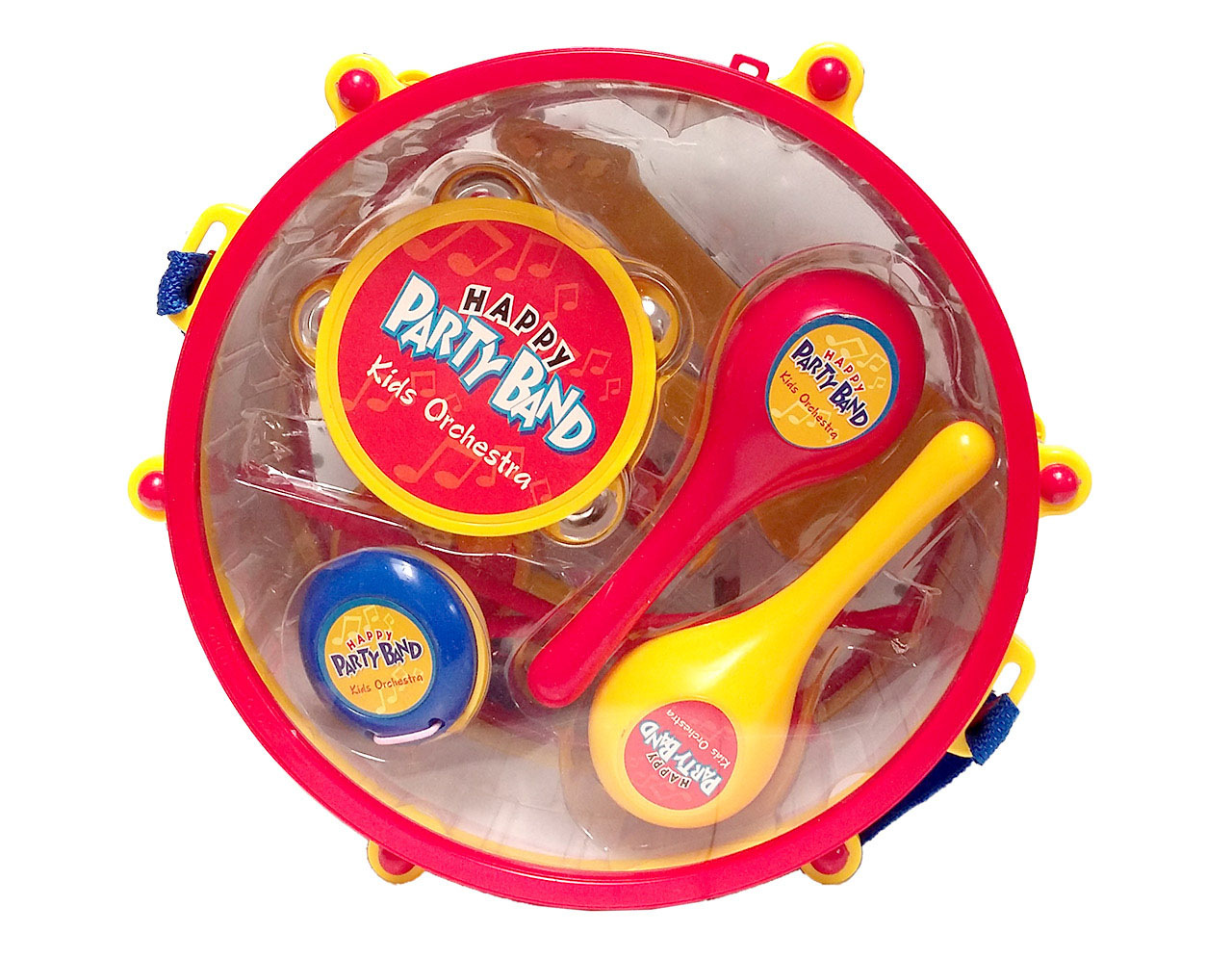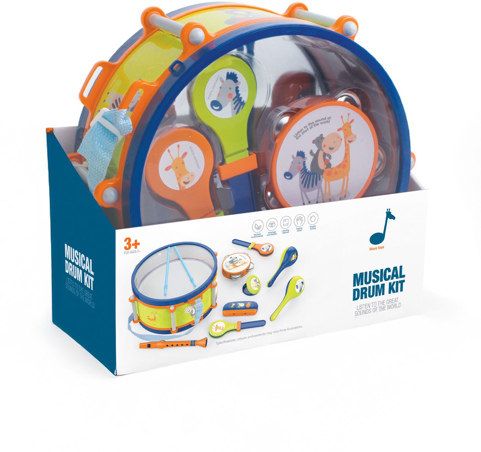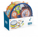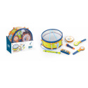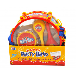 V tomto hudebním setu jsou zastoupeny nástroje několika skupin. Bicí nástroje zde zastupuje xylofon. Jeho kovové plátky jsou usazeny na filcových kroužcích, které regulují ostrost zvuku. Dřevěný rám i paličky propůjčují zvuku hloubku a sametovový tón. Rytmické nástroje zastupuje oblíbený maracas, který je zde tvořen plastovými vajíčky. Hloubka jejich zvuku se dá ovlivnit posazením nebo sevřením vajíčka v dlani. Zástupcem perkusních nástrojů je v tomto setu tamburína. Jedná se o bicí jednoblanný membranofon, který je tvořen dřevěným bubínkem po jehož obvodu se nachází rolničky. Používá se hlavně v italské lidové, romské a perské hudbě. Dalším zástupcem bicích nástrojů je triangl. U jednoho z vrcholů je rozdělen kvůli lepší rezonanci. Při hře je třeba jej zavěsit na prsty provázkem a tak zabránit tlumení tónů. Do trianglu se ťuká paličkou obsaženou v této sadě. Délka tónu se může regulovat zatlumením prsty. Věk: 3+. Počet ks: 8. Rozměr xylofonu: 25,5 cm, průměr tamburíny: 15 cm, výška t