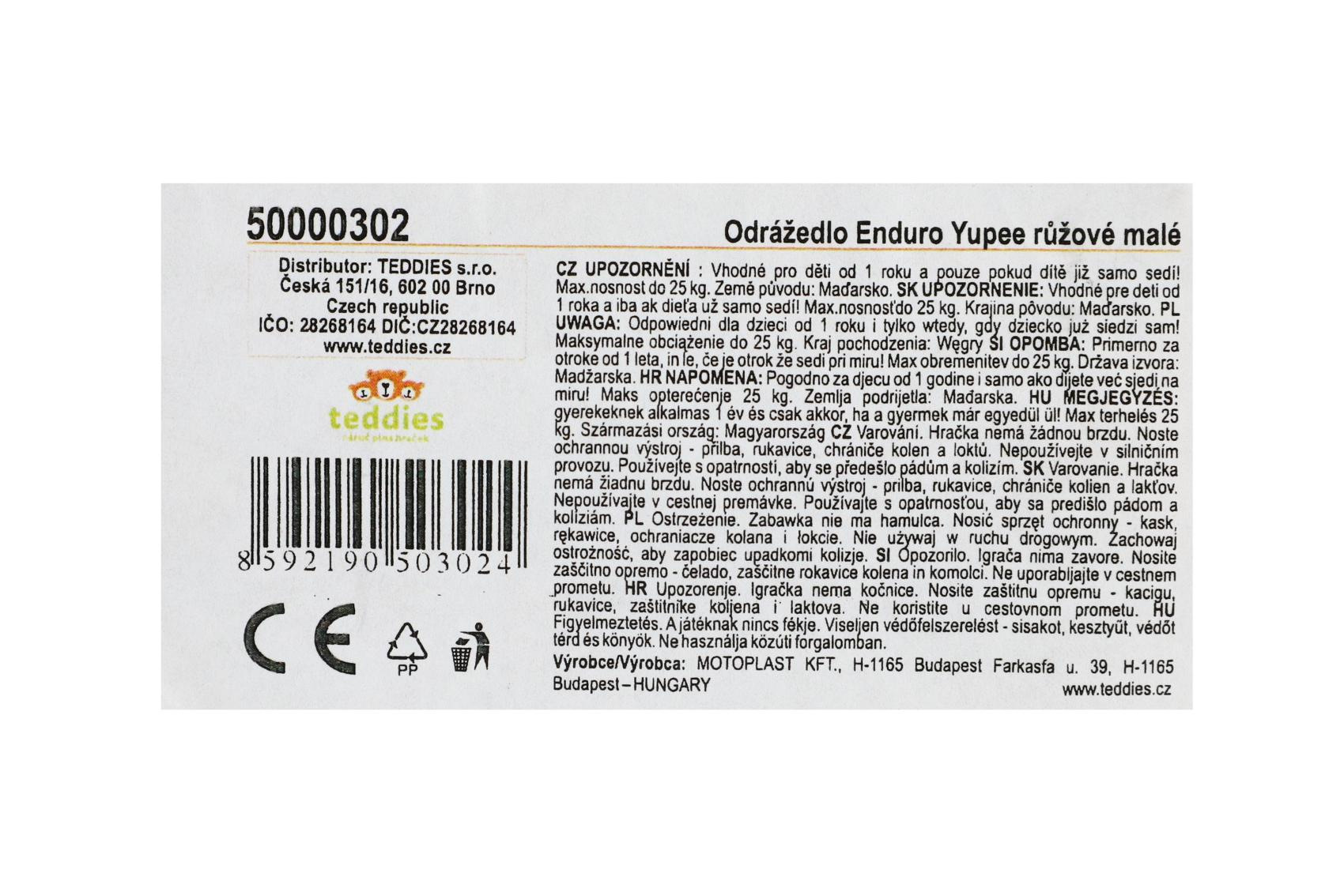 Popis Teddies Odrážedlo Enduro Yupee růžové malé plast výška sedadla 26cm nosnost do 25kg 12m+