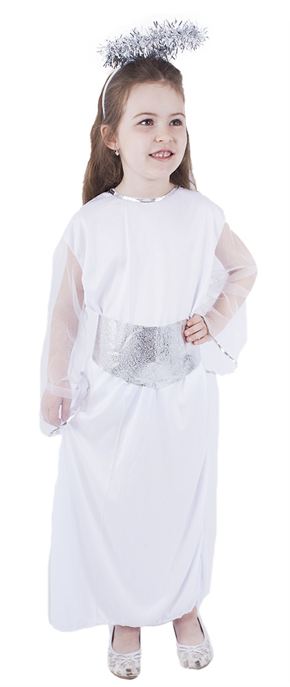 Půvabný karnevalový kostým s motivem anděla ve stříbrno-bílé barvě a velikosti S je určen pro holčič
