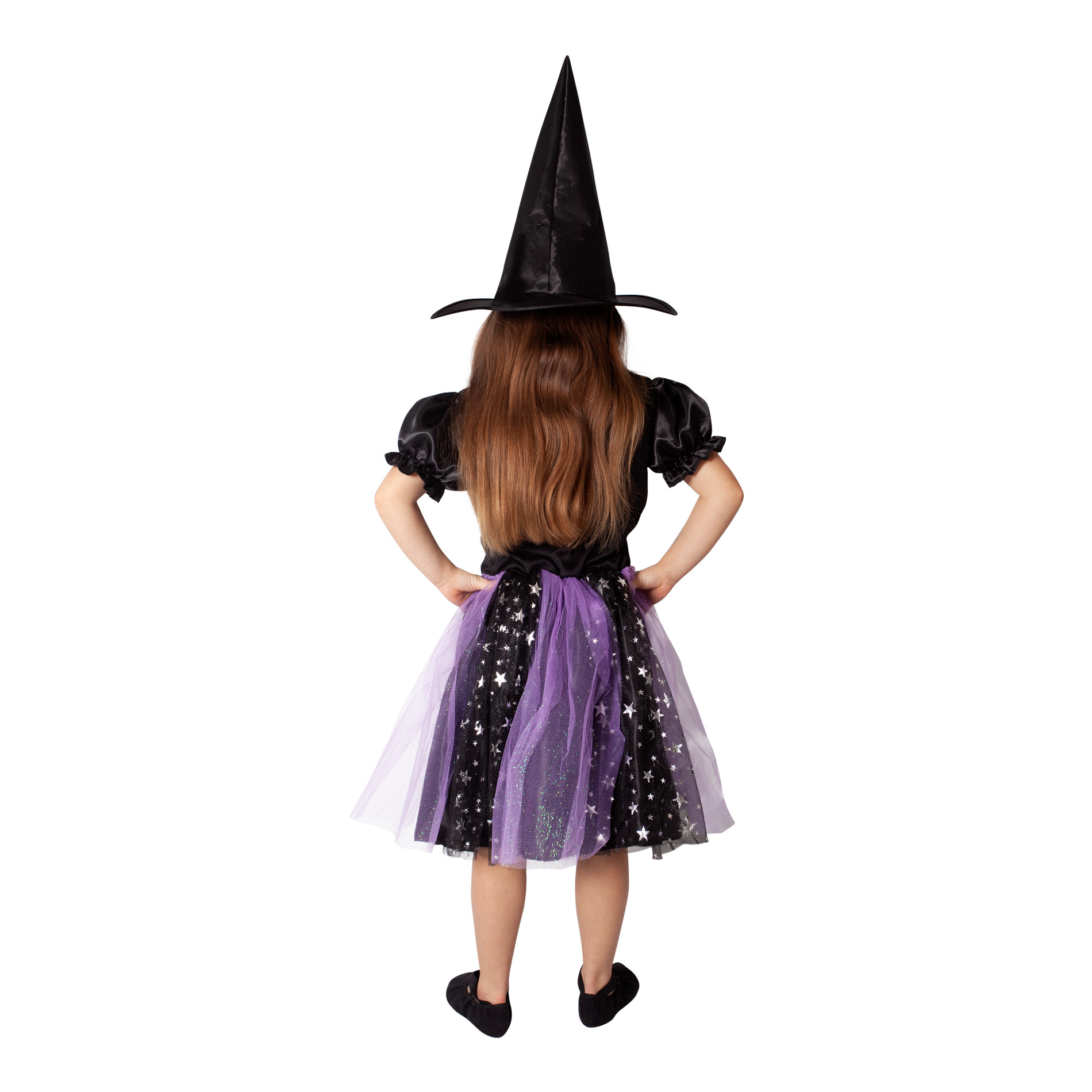 Parádní karnevalový kostým s motivem čarodějnice! Kostým fialovo-černé barvy ve velikosti S je určen pro holčičky ve věkovém rozmezí 3-6 let (105-116 cm). Šaty jsou zdobené potiskem stříbrných hvězdiček. Součástí balení je perfektně sladěný klobouk. Staň se hvězdou karnevalového nebo Halloweenského večírku! Nejen letos je potřeba myslet EKO-nomicky i EKO-logicky! EKO-balení je vhodné zejména pro e-shopy kde zákazník nakupuje dle fotografie a není třeba velkého balení s věšákem. EKO-logicky – na balení bylo použito méně plastu a dalších materiálů. Jedná se o malý transparentní obal s fotografií. EKO-nomicky –EKO-obal zabere jen polovinu místa – šetřete skladová místa s námi!