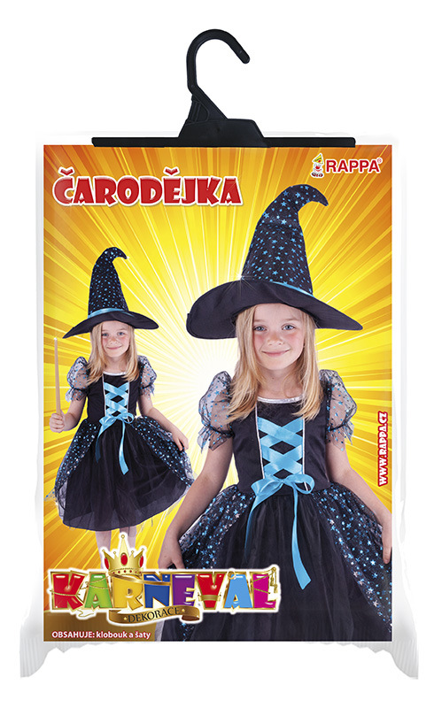 Parádní karnevalový kostým s motivem čarodějnice! Kostým modro-černé barvy ve velikosti S je určen pro holčičky ve věkovém rozmezí 4-6 let (105-116 cm). Šaty jsou zdobené tyrkysově modrou stuhou a metalickými hvězdičkami. Součástí balení je perfektně sladěný klobouk, který je rovněž zdoben modrými hvězdičkami a stuhou. Staň se hvězdou karnevalového nebo Halloweenského večírku!