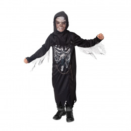 Strašidelný karnevalový kostým s motivem smrtky! Kostým ve velikosti S je určen pro děti ve věkovém rozmezí 4-6 let (105-116 cm). Balení obsahuje černý hábit s bílým potiskem kostry a kapuci. Součástí kostýmu je řetěz. Neobsahuje kosu.
