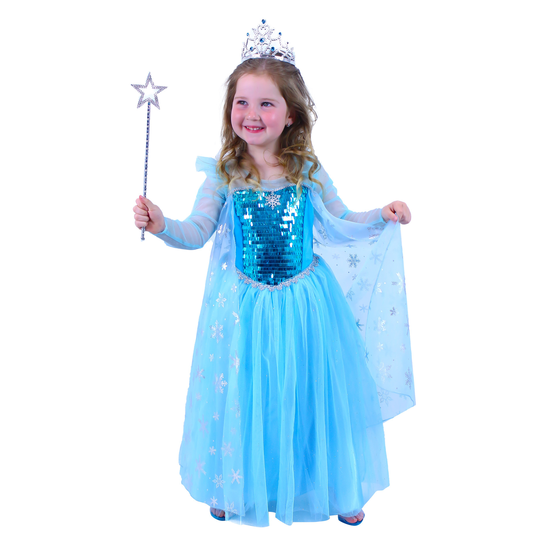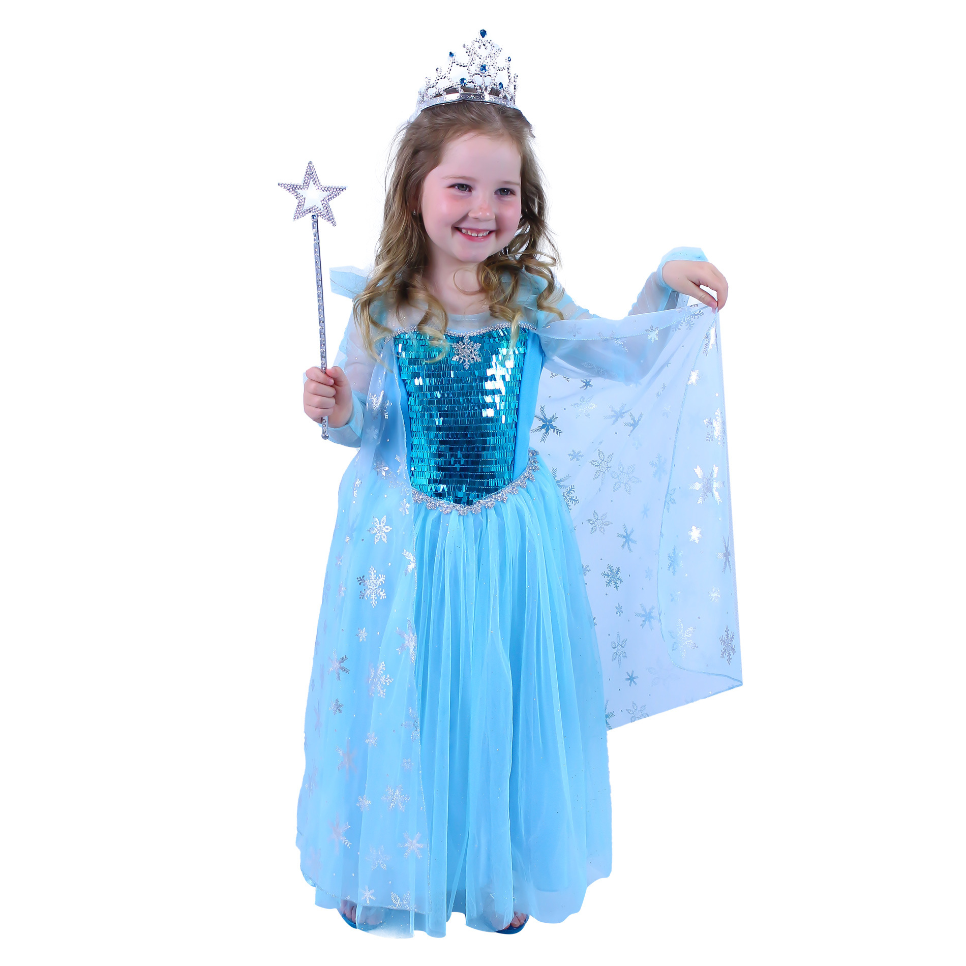 Okouzlující dívčí kostým pro malé zimní princezny! Kostým ve velikosti S je určen pro holčičky ve věkovém rozmezí 4-6 let (105-116 cm). Kostýmek je ušit v tyrkysově modré barvě a je zdoben oslnivými flitry a stříbrným lemováním. Součástí šatů je také plášť dekorován třpytivými sněhovými vločkami.