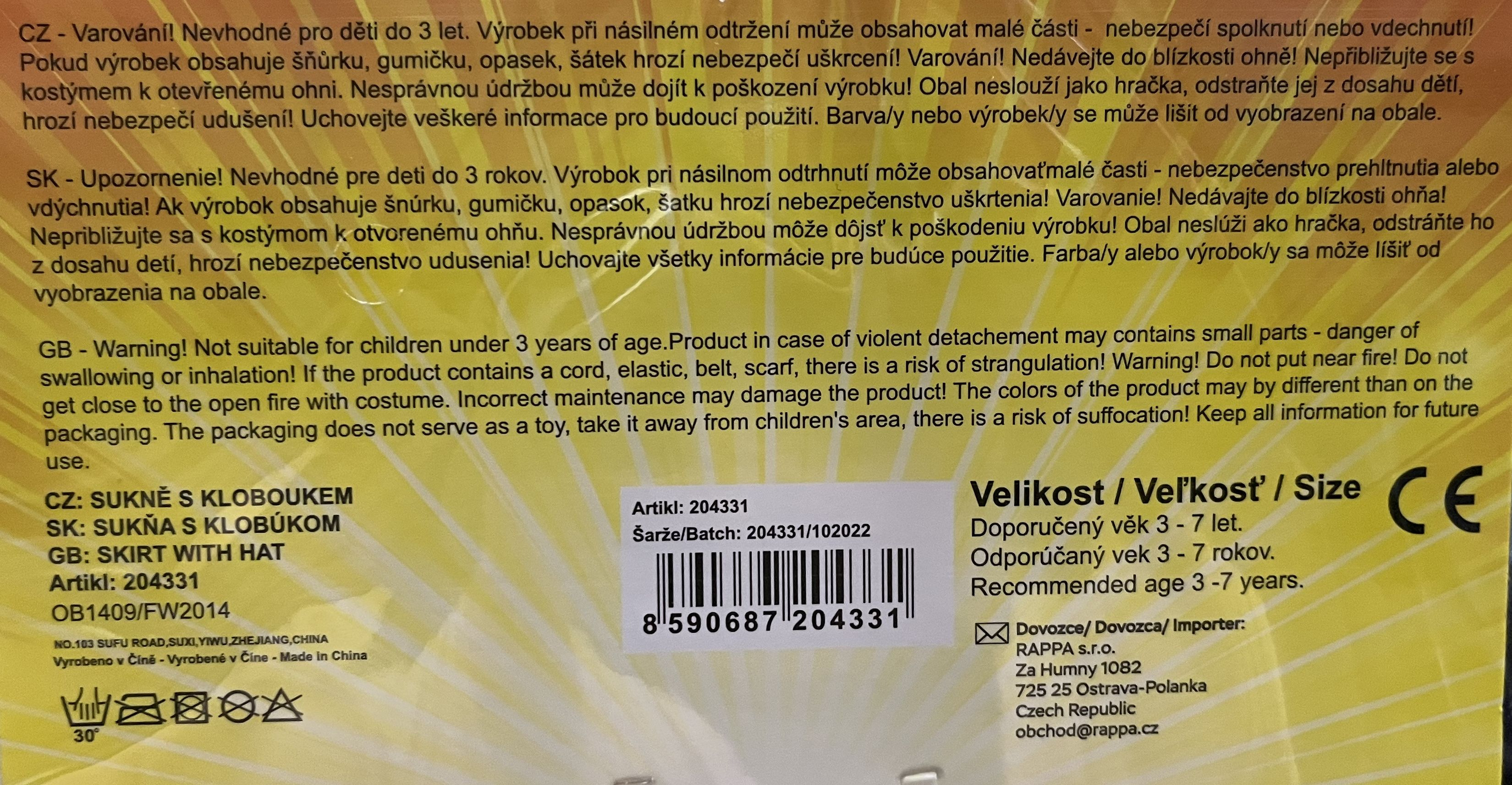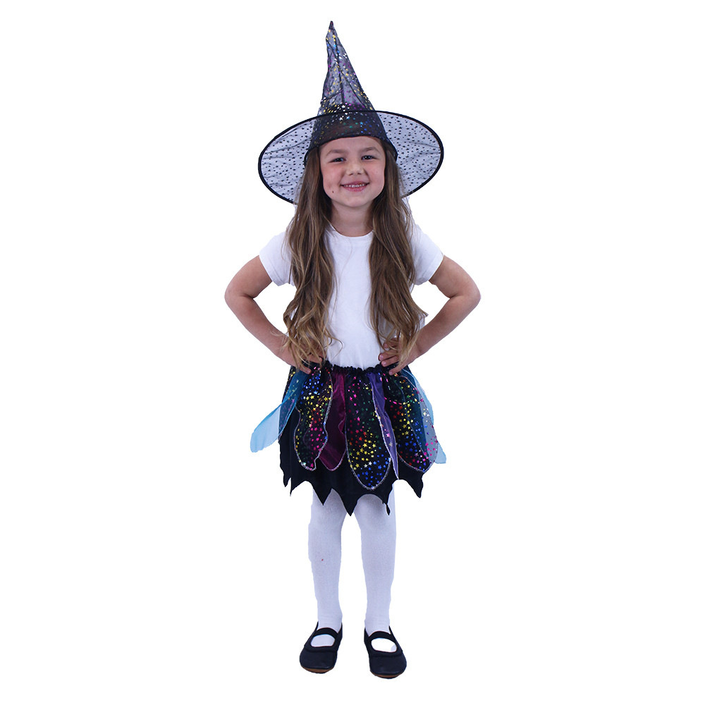 Magická sukýnka pro malé čarodějnice! Kostýmek černé barvy zdobený barevným dekorem je určen pro holčičky ve věkovém rozmezí 3-7 let. Balení obsahuje nadýchanou sukničku a k tomu perfektně sladěný klobouk. Sukně je v pase na gumičku a její délka je 35 cm. Vhodný i na oslavu Halloweenu.