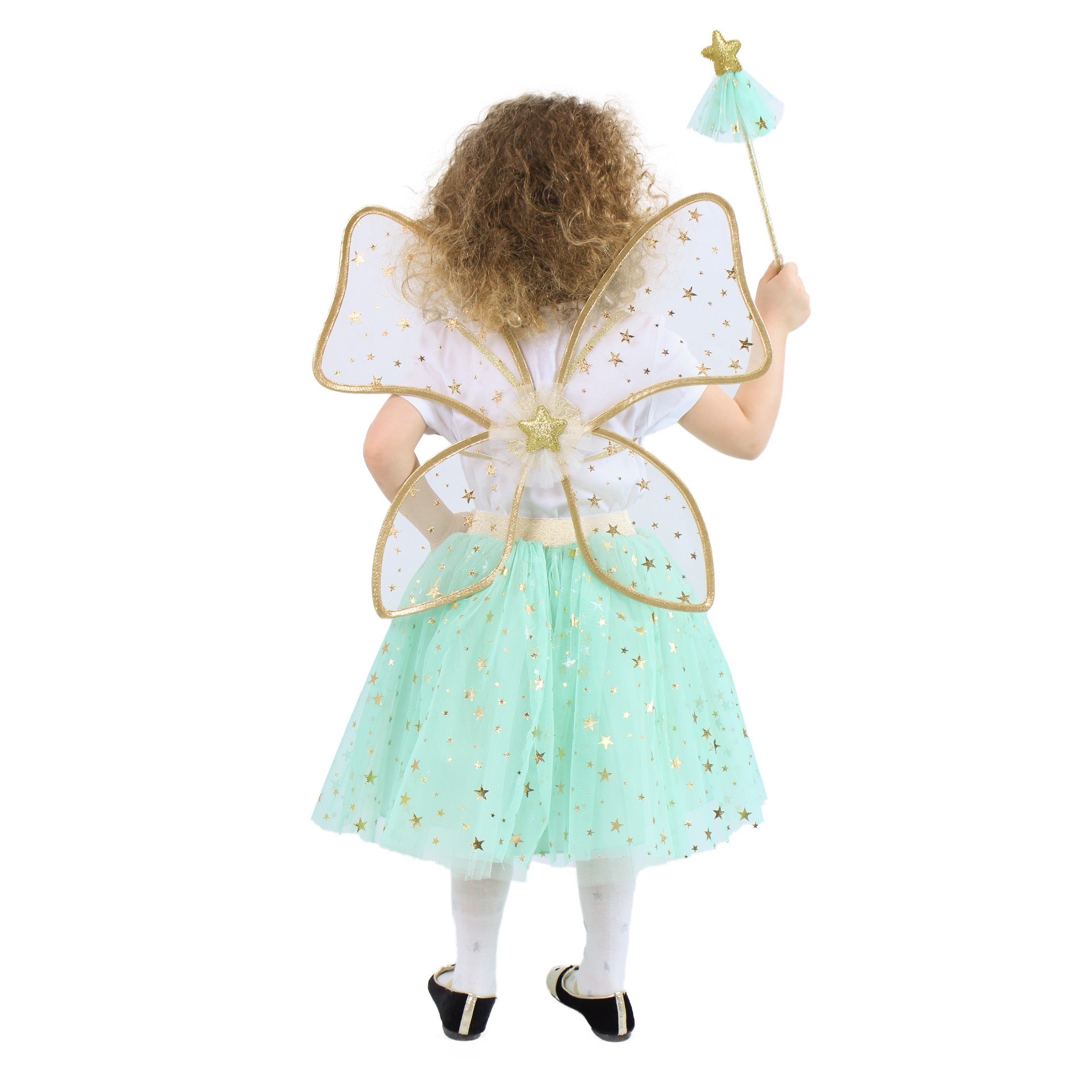 Krásná vílí sada pro malé holčičky! Sada obsahuje zelenou tylovou TUTU sukýnku s potiskem zlatých hvězdiček a zlatou gumou v pase, k tomu perfektně sladěná křídla a hůlku ve stejném motivu. Sukně je dlouhá cca 35 cm a je vhodná pro obvod pasu 50-60 cm. Určeno pro holčičky ve věkovém rozmezí 3-10 let (104-146 cm).