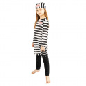 Pruhovaný karnevalový kostým vězeňkyně v typických bílo-černých barvách ve velikosti S je určen pro děvčata ve věku 4-6 let (105-116 cm). Kostým obsahuje dlouhé triko a čepici s číslem vězně.