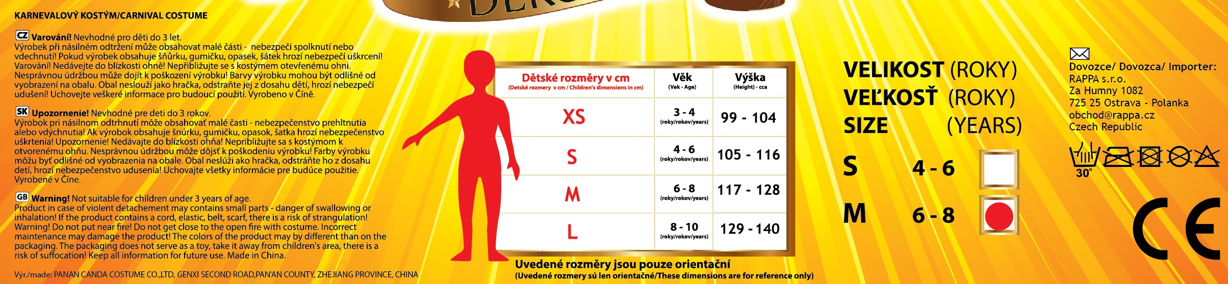 Karnevalový kostým ninja ve velikosti M je určen pro chlapce ve věkovém rozmezí 6-8 let (116-128 cm). Balení obsahuje overal, vestu zdobenou žlutými bojovnými motivy, kuklu, čelenku, opasek a pásky na ruku.