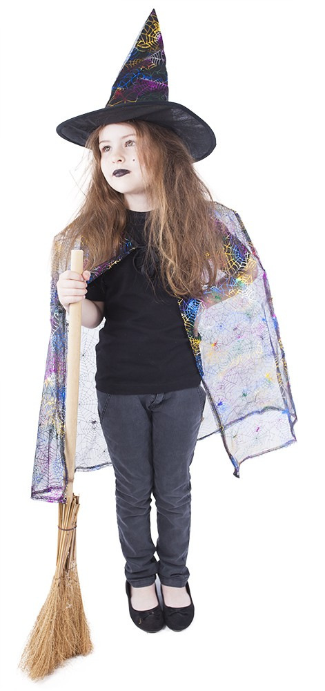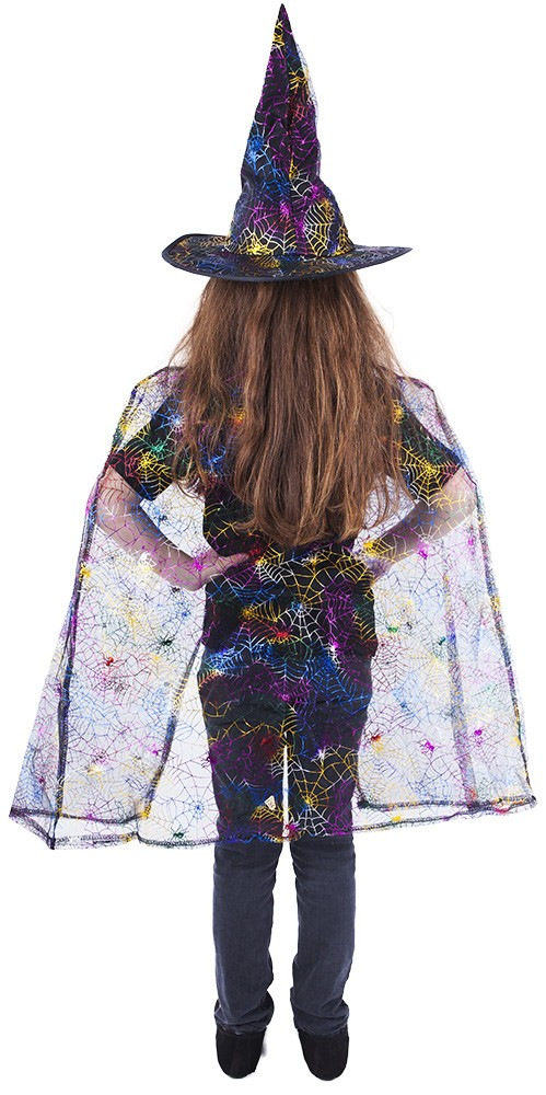 Krásná sada na čarodějnice nebo halloweenský večírek! Komplet obsahuje plášť a perfektně sladěný klobouk. Vše je dekorováno metalickými magickými motivy různých barev. Doporučeno pro děti ve věkovém rozmezí 3-7 let.