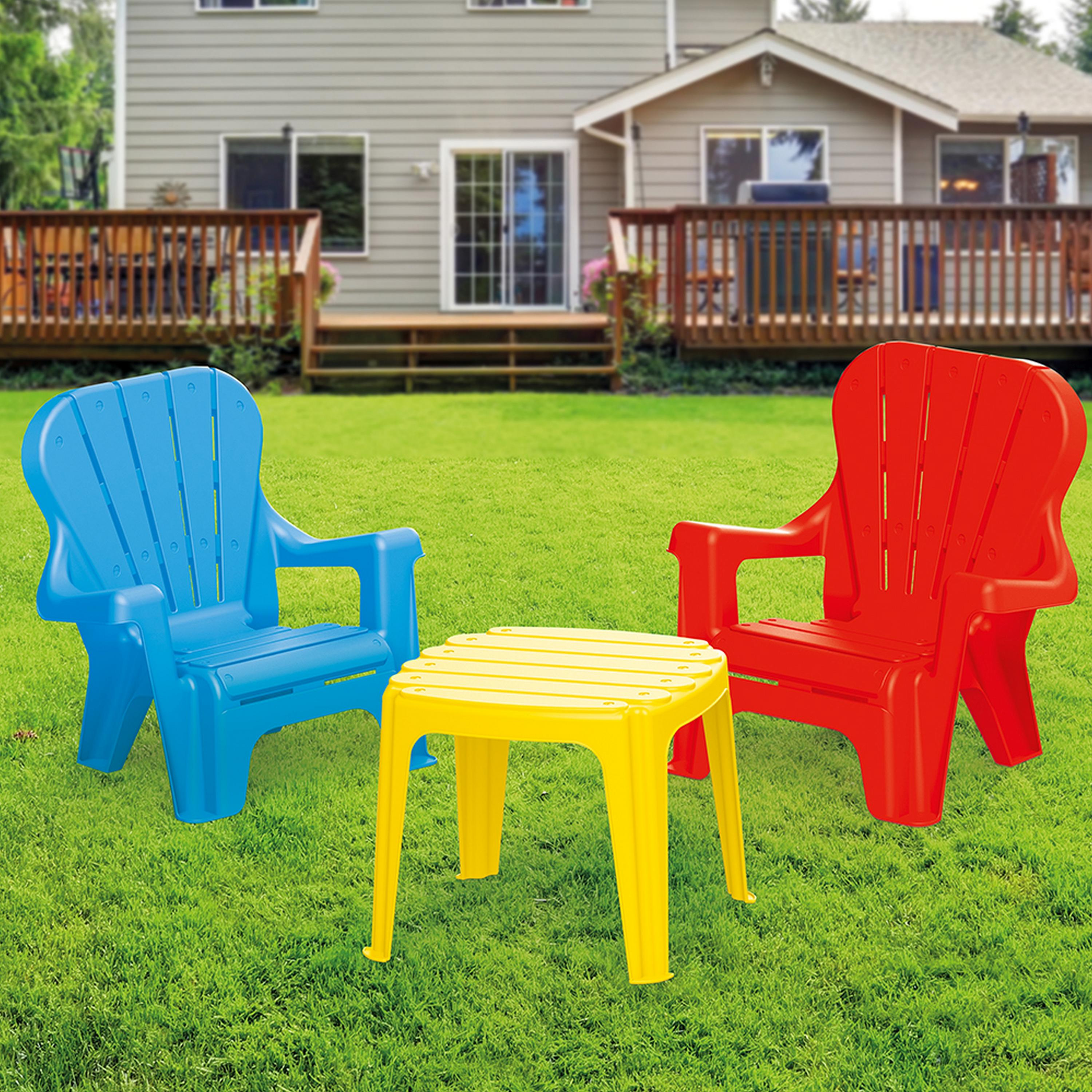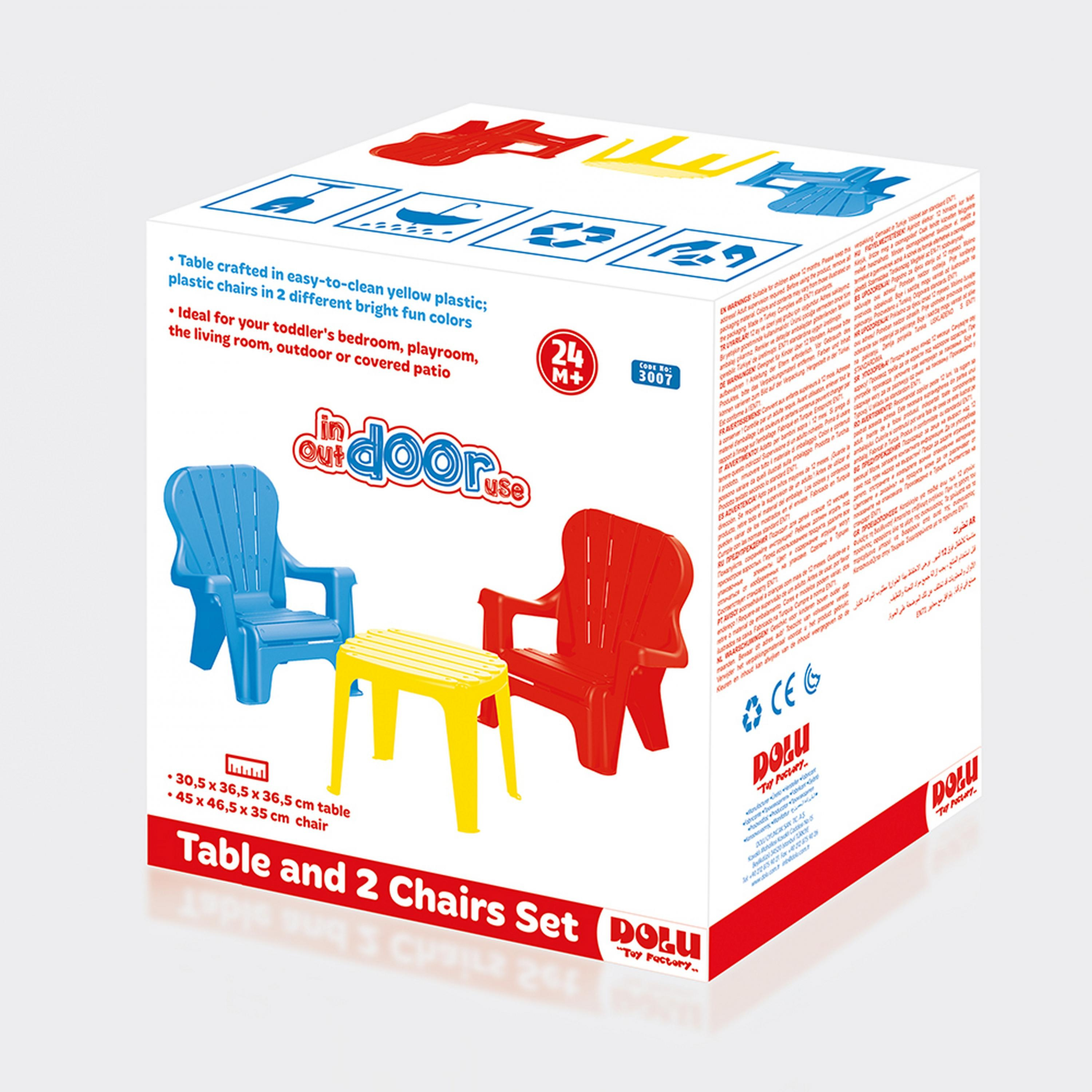 Dětský stoleček se dvěmi židličkami je vhodný pro vnitřní i venkovní použití. Děti mohou stoleček používat pro své hry, při kreslení a různých výtvarných činnostech. Vyrobeno z kvalitního a odolného materiálu. Věk: 24m+. Rozměr: žlutý stoleček: 30,5 x 36,5 x 36,5 cm, modrá a červená židlička: 45 x 46,5 x 35 cm. Nosnost výrobku 25 kg.