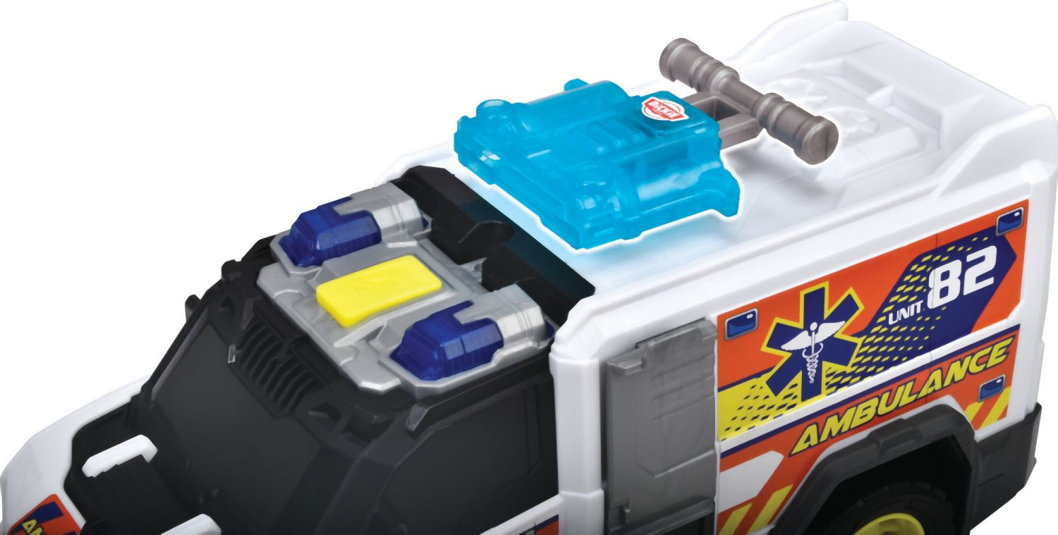 Auto ambulance na volnoběh s nosítky. Světelné a zvukové efekty, manuální vystřelovací funkce, otevírací zadní dveře a boční zásuvné úložiště. Tajná skrýš v podvozku, kde je možné ukrýt vystřelovací disky a nosítka, Délka 30 cm.