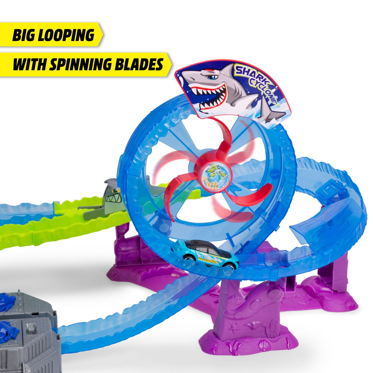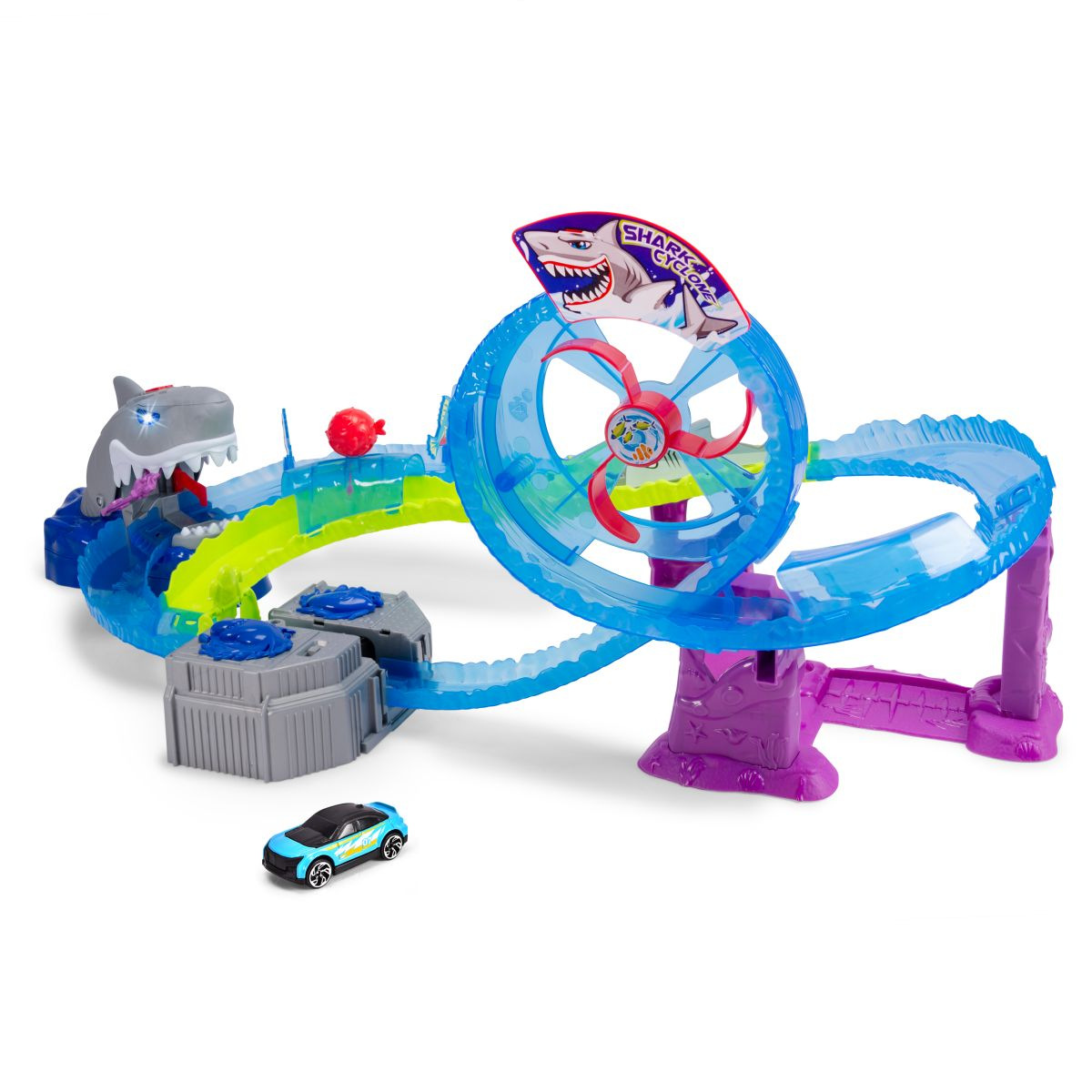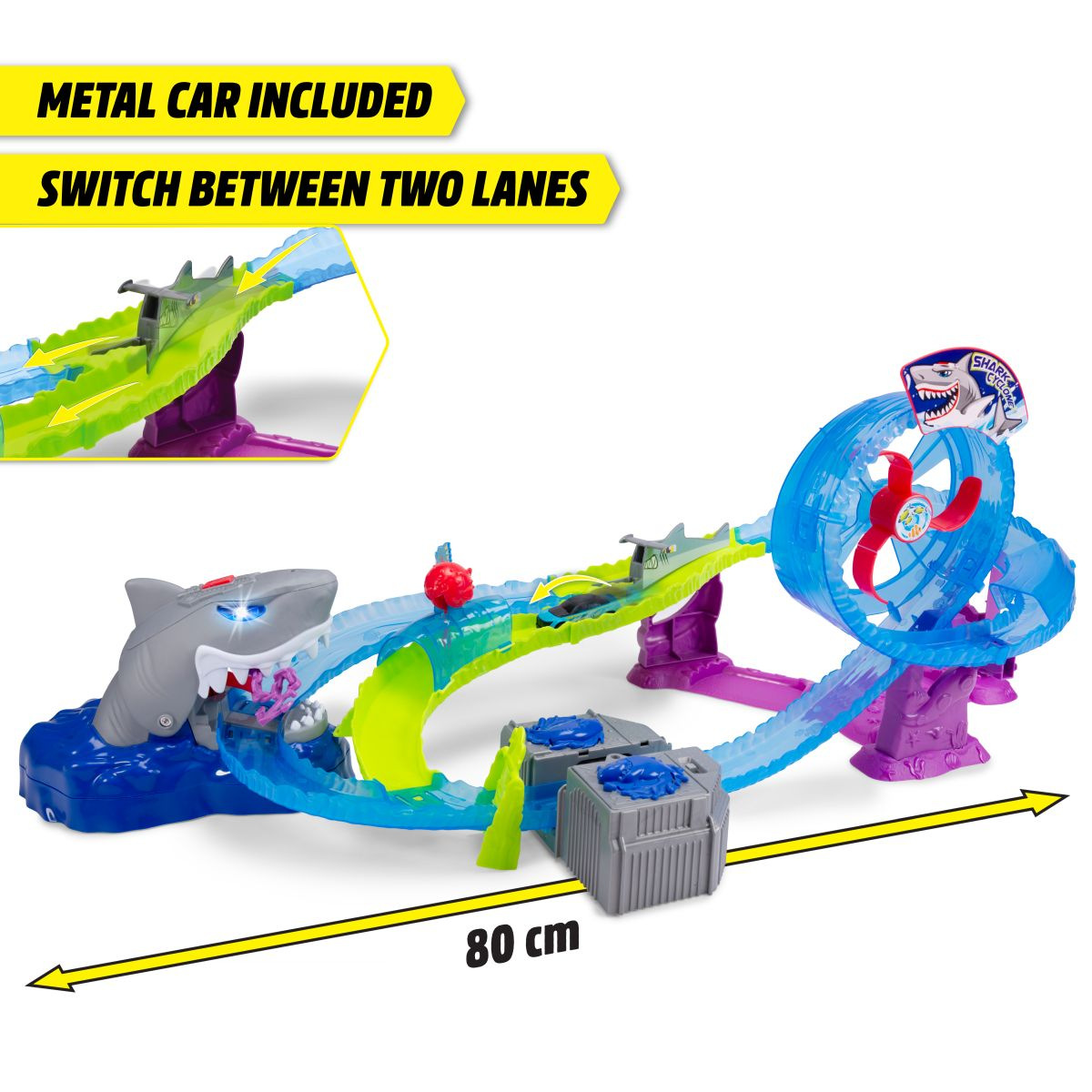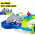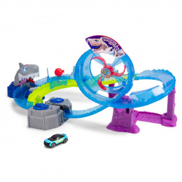 Autodráha White Shark o délce 80 cm. Motorizovaná žraločí dráha se smyčkou. Světelná i zvuková funkce - hrozivé podvodní zvuky, světelné efekty a žraločí řev. Auta se plnou rychlostí řítí smyčkou, přejíždějí vodní tunel nebo přistávají přímo u velkého bílého žraloka – ale pozor, může kdykoli zkousnout čelisti. Turbo booster přivádí vozidla na nejvyšší rychlost. Součástí je kovové autíčko. Rozměry autodráhy: 50 x 55 x 32 cm.