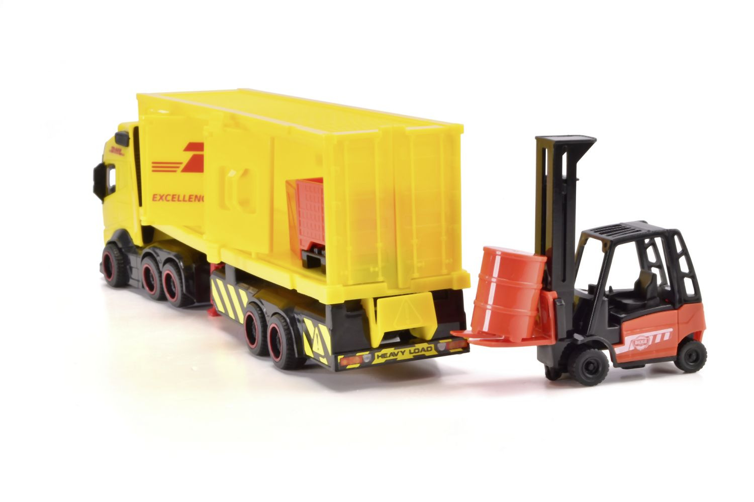 Nákladní vůz DHL Volno FH 16 na setrvačník se světelnými a zvukovými efekty a pohyblivými díly. Součástí kontejnerový příves a vysokozdvižný vozík na volnoběh, 12 cm. Délka 35 cm, barva žlutá/červená.