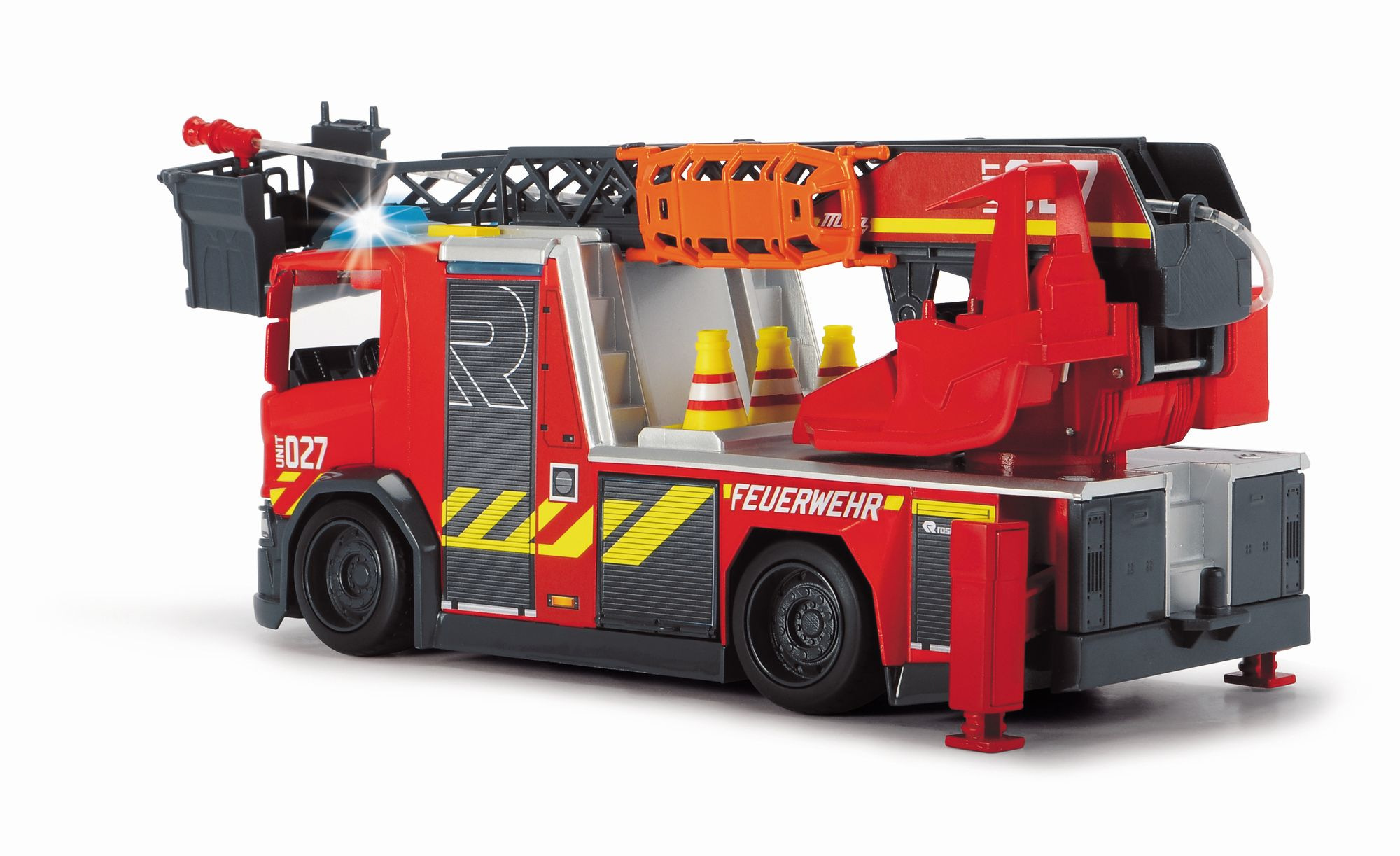 Hasičské auto Scania na volnoběh, se světelnými a zvukovými efekty a stříkací funkcí. Výsuvný žebřík a stabilizační opěry, nosítka, otevírací boční panely. Délka 35 cm
