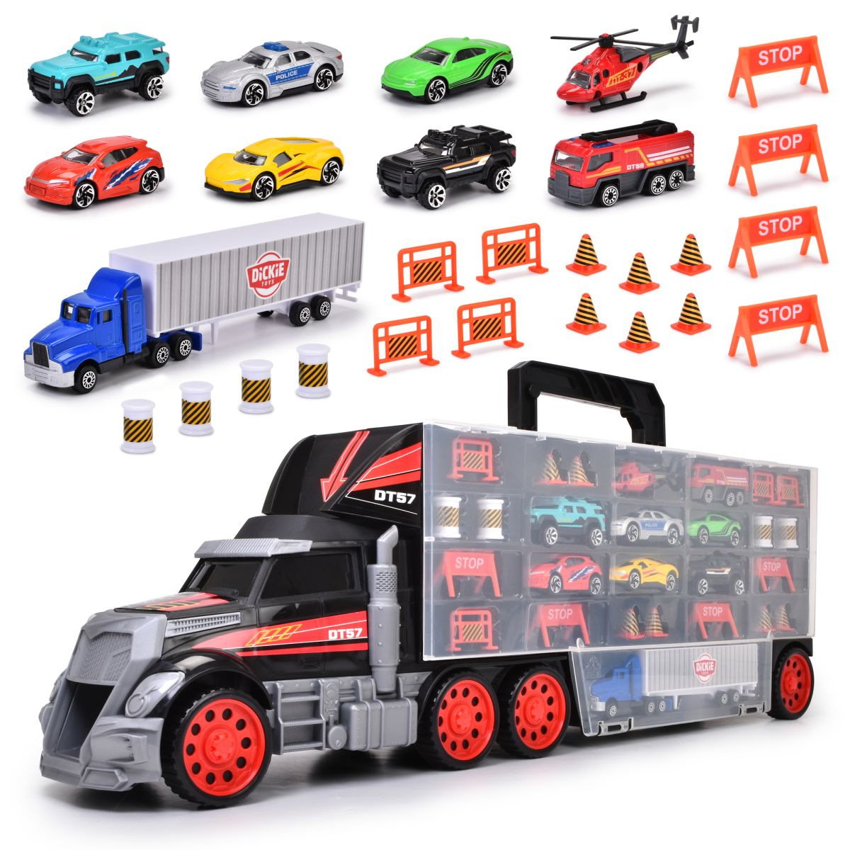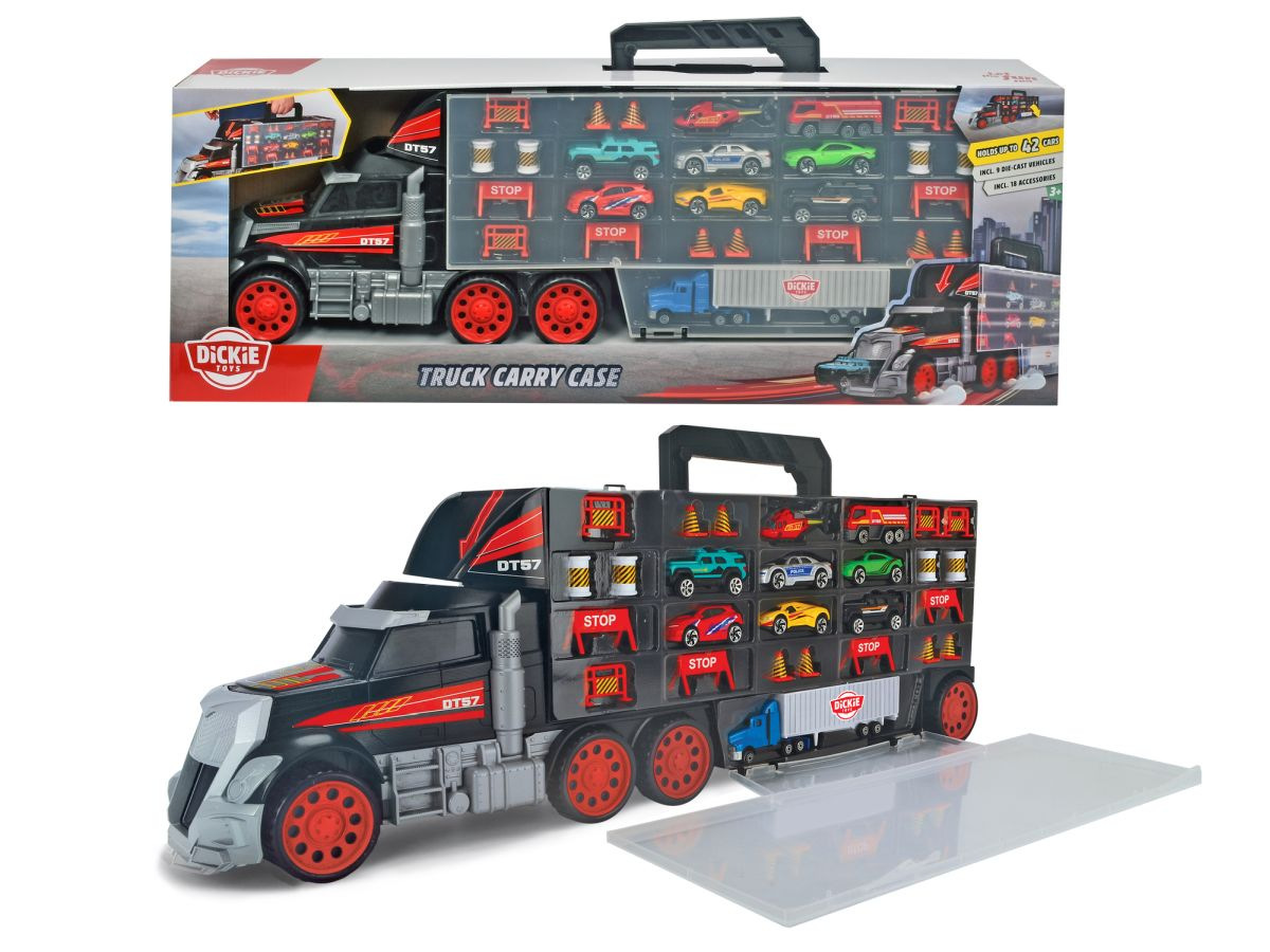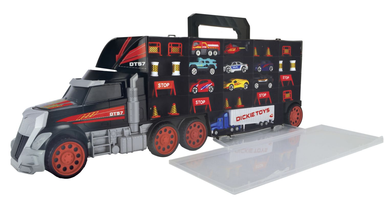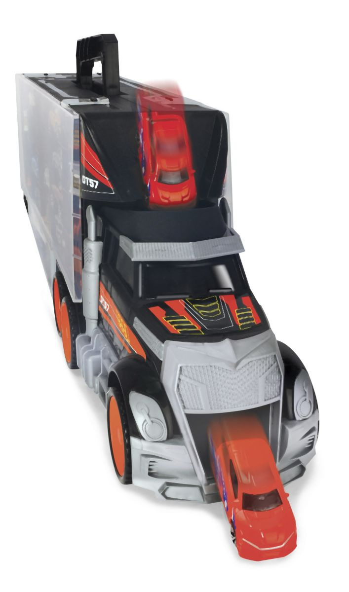 Velká souprava s příslušenstvím ve tvaru kamionu, s rukojetí. Včetně 7 kovových autíček, nákladního auta a vrtulníku. S manuální vystřelovací funkcí z kabiny kamionu. Délka 62 cm.