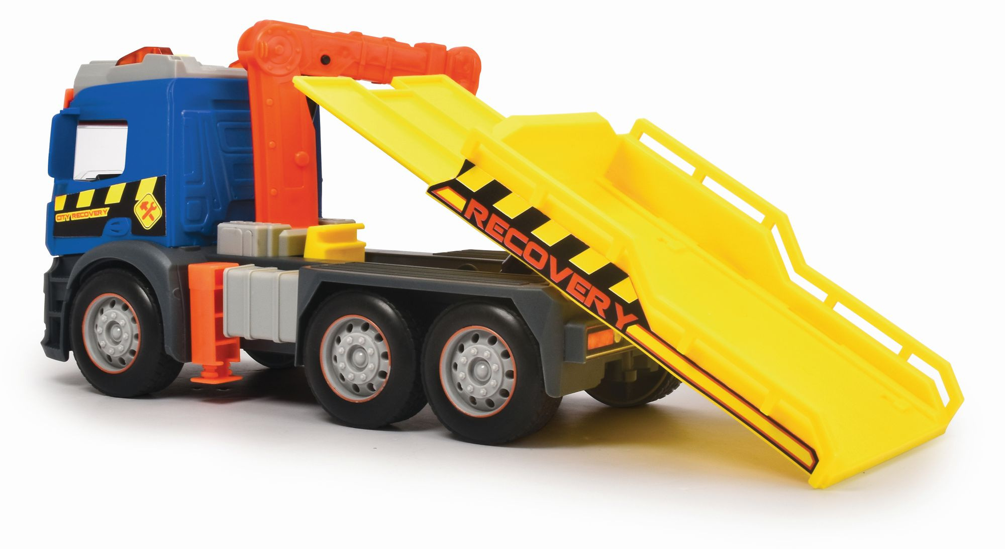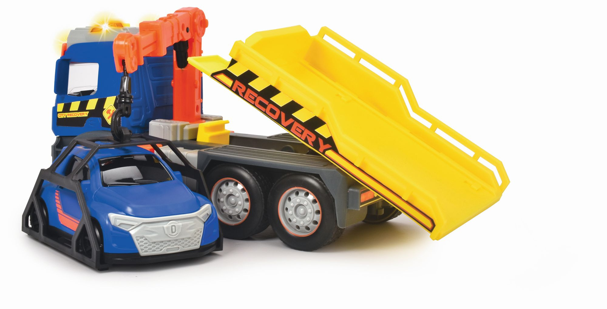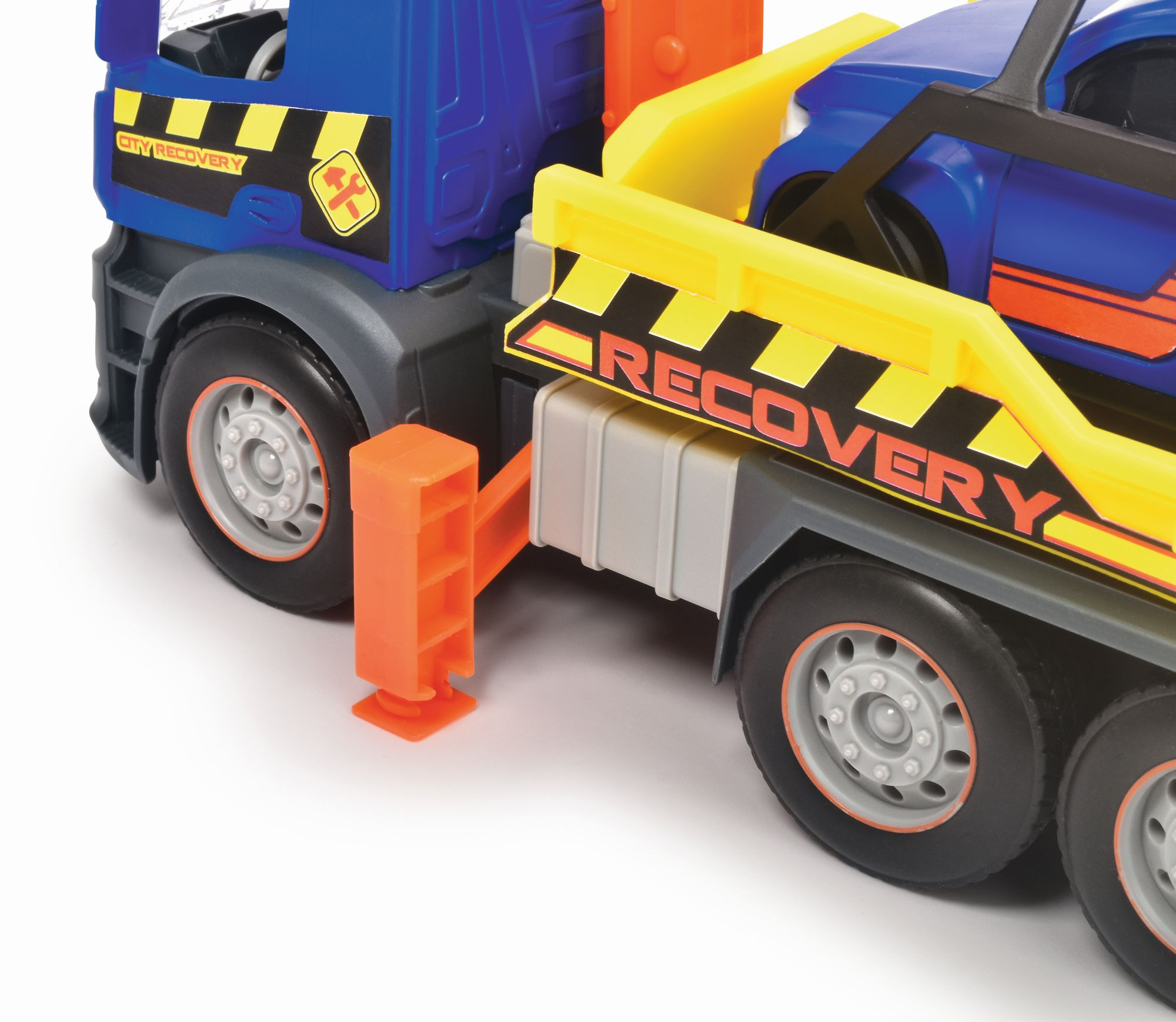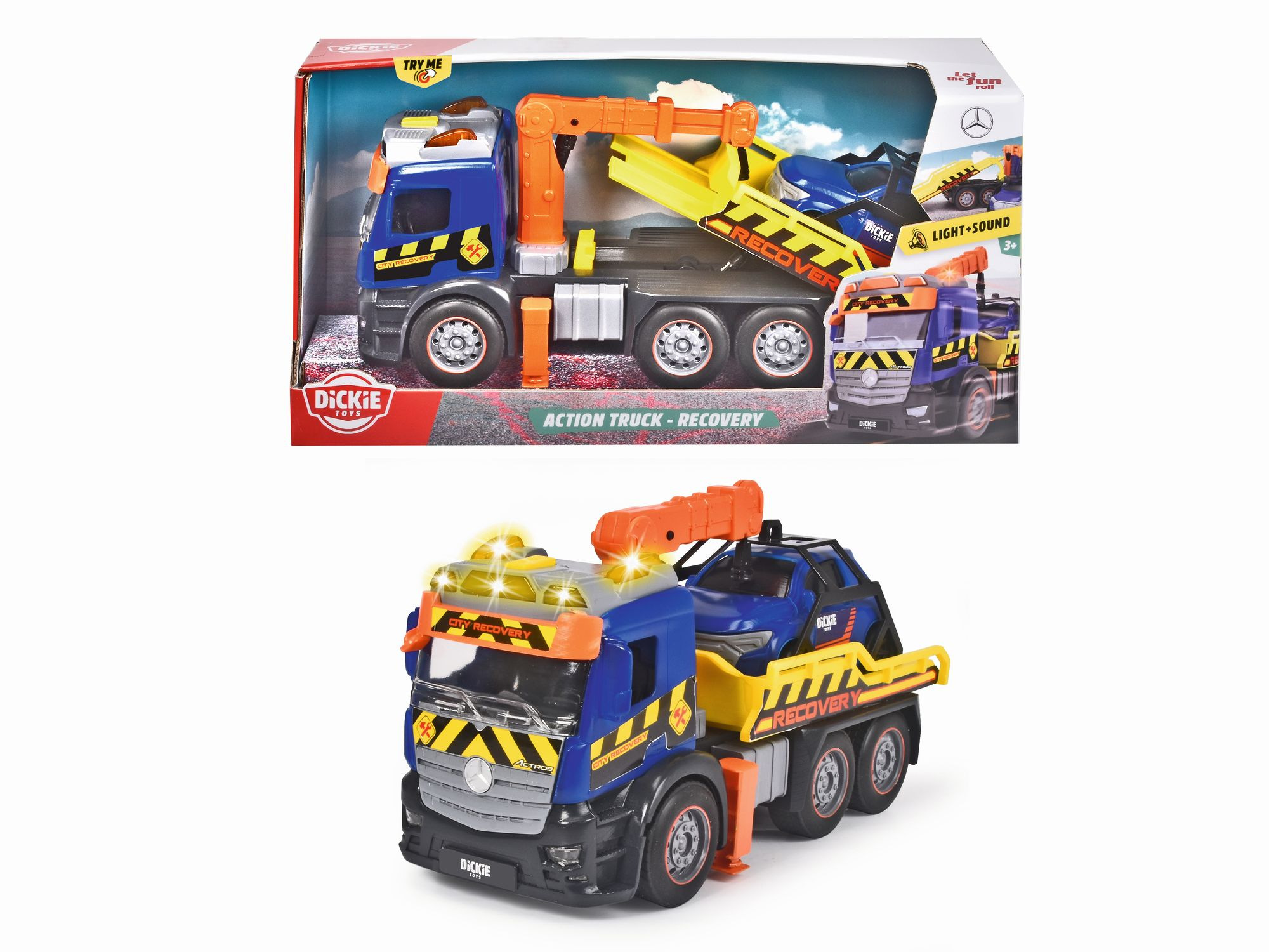 Odtahový vůz Mercedes na setrvačník se světelnými a zvukovými efekty a pohyblivými díly, délka 26 cm. Součástí osobní auto na volnoběh, 12 cm.