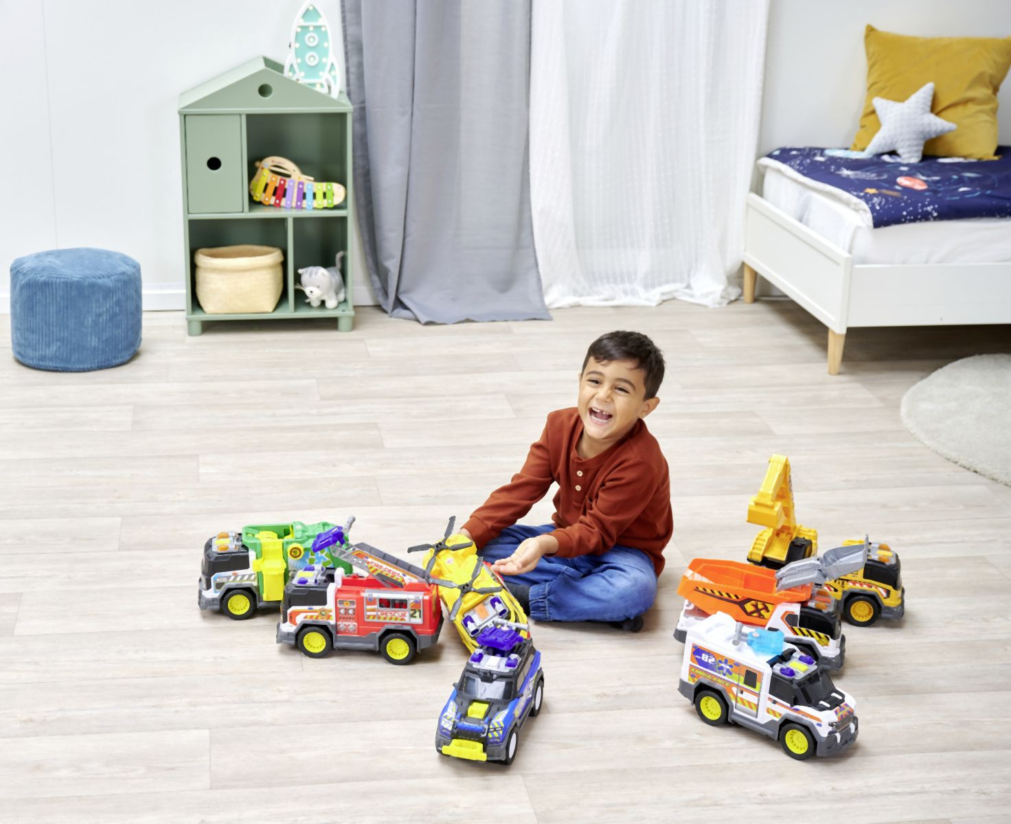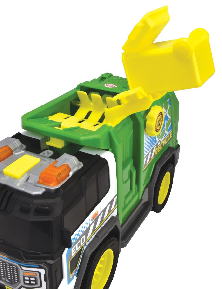Popelářské auto zelené na volnoběh, s manuální funkcí zvedání popelnice. Zvukové a světelné efekty, otevírací zadní panel. Popelnice součástí. Délka 30 cm.