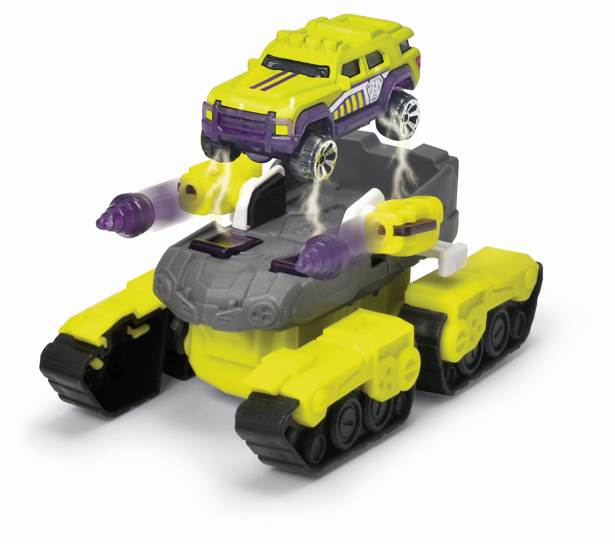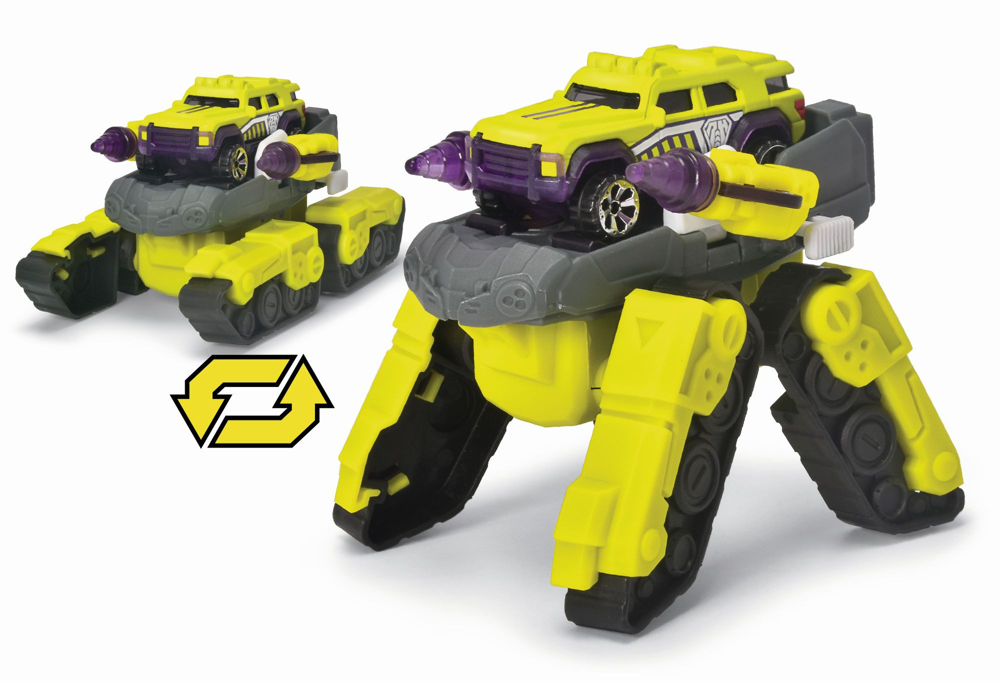 Skládací transformer vozidlo 2 v 1 - tank a inovativní robotické vozidlo. Vozidlo pro speciální operace, tank se bez námahy pohybuje po jakémkoli terénu. Když se přiblíží k překážce, jednoduše rozloží své pavoučí nohy a promění se v robota. Včetně kovového autíčka (7,5 cm) na palubě, které lze připevnit a sejmout pomocí klipsu. Auto lze ručně přeměnit na robota. Pokud by nestačila funkce 2 v 1 a přídavné silniční vozidlo, má futuristické vozidlo také dvě manuální věže po stranách. Kabina vozidla je kompatibilní s podobnými modely, stejně jako stavební bloky ve střeleckých zařízeních. V měřítku 1:64. Výška 12 cm.