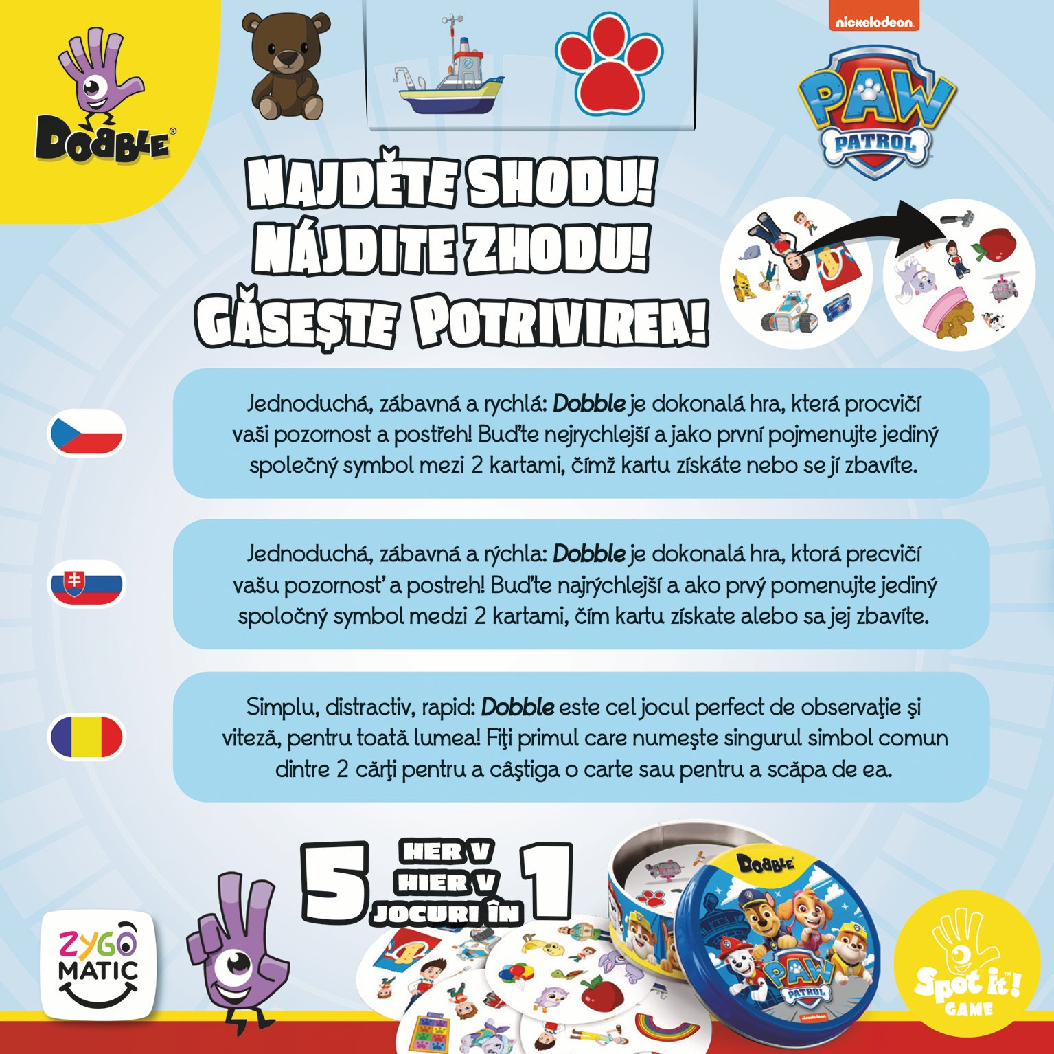 Rychlost, postřeh, reflexy! Dobble PAW Patrol, to je 55 karet, 8 obrázků na kartě a každé dvě karty spolu mají společný jen jeden obrázek! Všechny obrázky (symboly) jsou popsané v pravidlech.