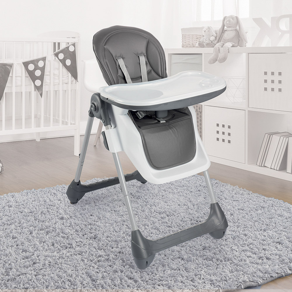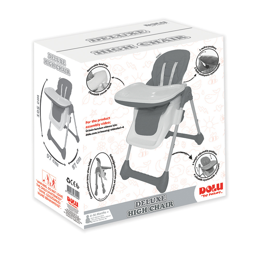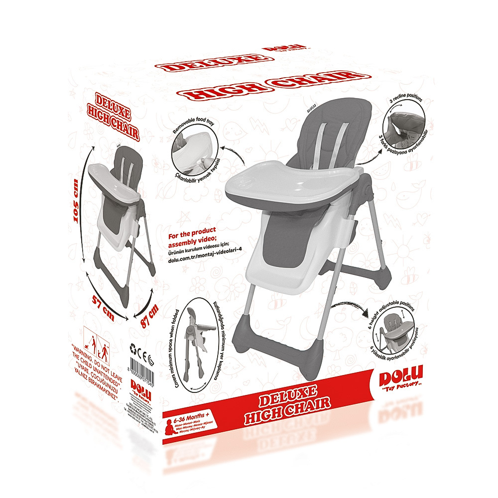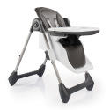 Dětská jídelní židlička deluxe v šedo-bílém provedení. Díky 5-bodovému bezpečnostnímu pásu je zajištěna maximální bezpečnost dítěte. Jídelní židlička je stabilní, pohodlná a potah je snadno omyvatelný. Jídelní pult je odnímatelný. Židlička má 6 výškově nastavitelných poloh. Zádová opěrka má 3 pozice sklopení. Složená židlička zabere minimální prostor. Vyrobeno z kvalitního a nezávadného materiálu. Rozměr cca: 105 x 57 x 87 cm. Rozměr balení: 61 x 32 x 22,5 cm. Věk: 6m+. Video: https://www.youtube.com/watch?v=GGsUL1HPOi4