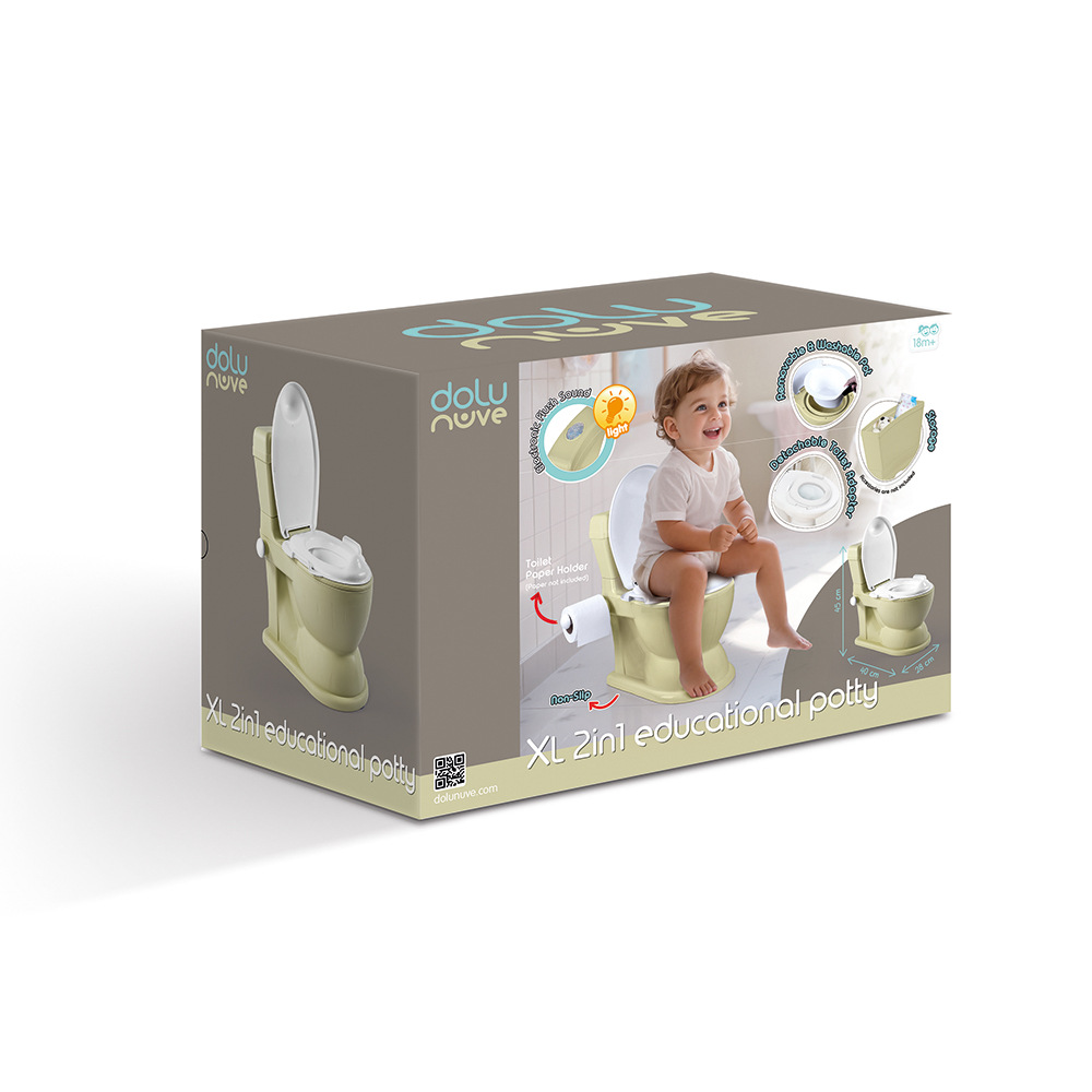 Začněte své děťátko učit na toaletu s realistickým nočníkem XL. Nočník vypadá jako skutečná toaleta. Je vybaven držákem na toaletní papír, tlačítkem se světelnými a zvukovými efekty a úložným prostorem. Po stisknutí tlačítka se ozve realistický zvuk spláchnutí. Protiskluzová základna pro lepší pro stabilitu a bezpečnost. Splachovací nádržka nočníku slouží jako úložný prostor, kde můžete uložit například vlhčené ubrousky. Vyjímatelná vnitřní komora pro snadné vyprazdňování a čištění zajišťuje dokonalou hygienu. Další výhodou je odnímatelné WC sedátko, které lze použít jako redukce WC prkénka na klasické toaletě. Nočník ve světle zeleném odstínu Eco Green má elegantní design a příjemný materiál, šetrný k citlivé dětské pokožce. Vhodné pro děti od 18 měsíců. Vyrobeno z odolného plastu. Potřebné baterie: 3 x 1,5V LR44 AG13 (jsou součástí). Rozměry nočníku: 45 x 28 x 40 cm. Rozměry balení: 45 x 28 x 40 cm.