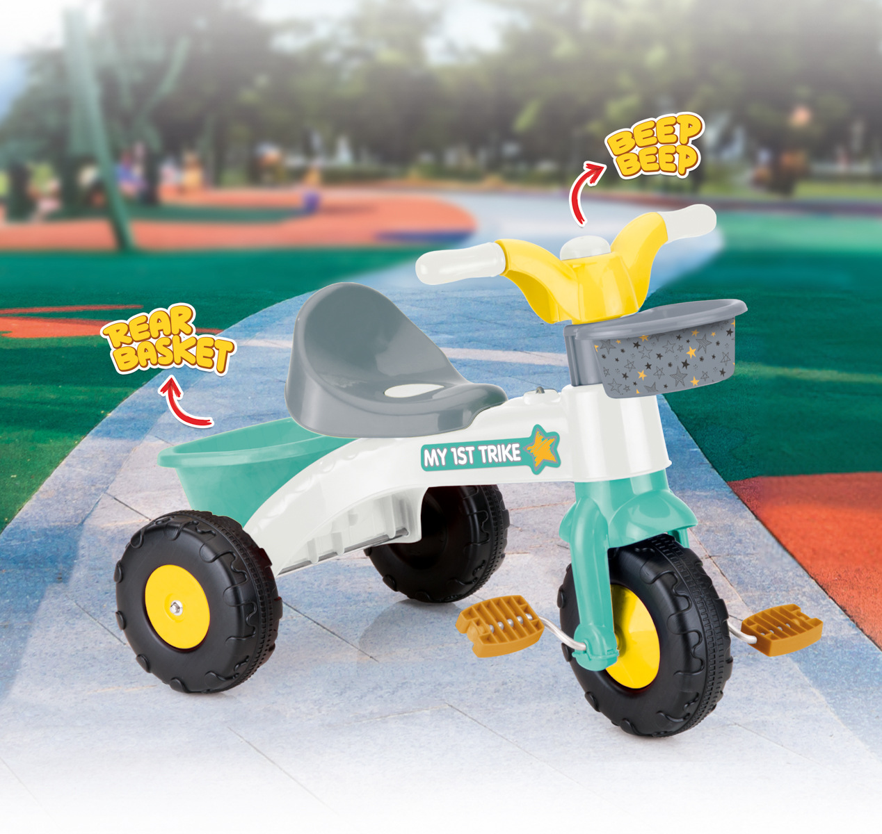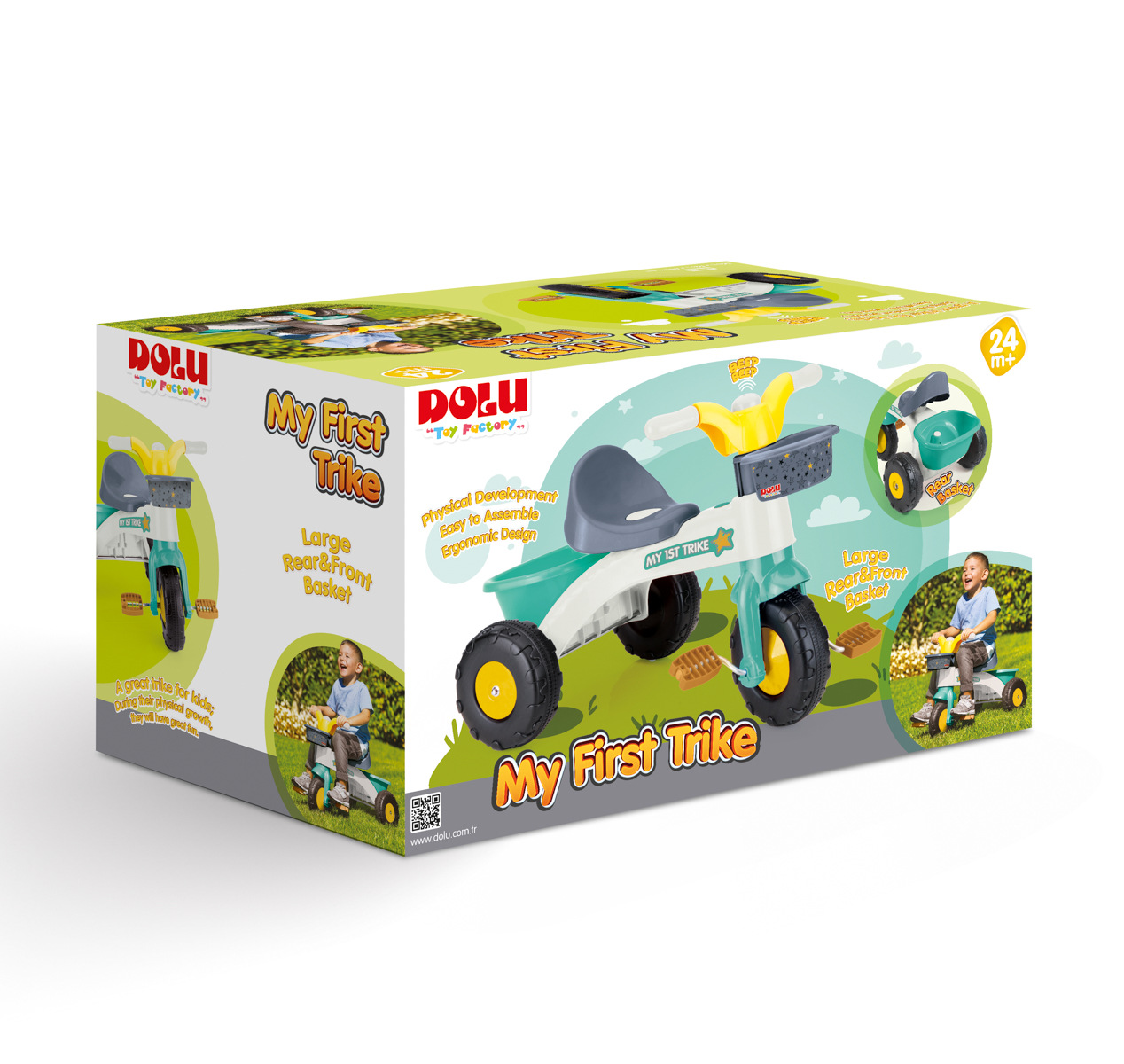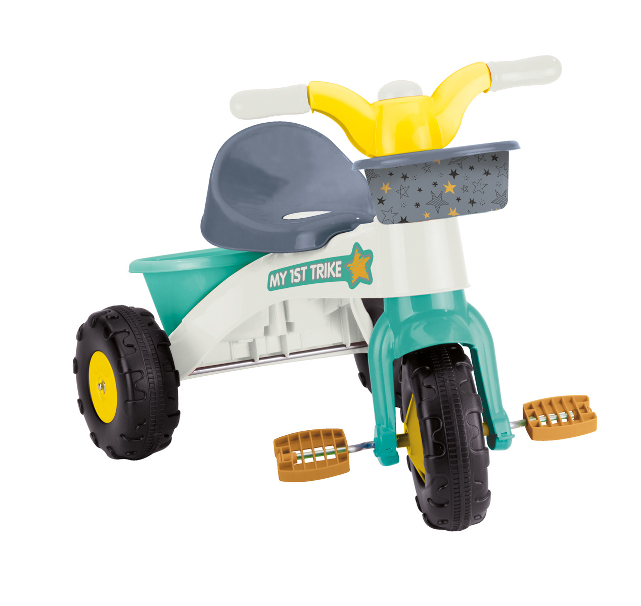 Dětská tříkolka My First Trike je vybavena odnímatelnou rodičovskou rukojetí, jejíž výšku lze nastavit dle potřeby. Tříkolka má robustní konstrukci a plastová kolečka, která se hladce pohybují téměř po jakémkoliv povrchu. Tříkolka je vybavena klaksonem a košíkem vpředu i vzadu. Tříkolka je poháněna pedály s volnoběhem. Přispívá k rozvoji koordinace a rovnováhy. Snadná montáž. Vhodné pro použití v interiéru i exteriéru. Vyrobeno z odolného plastu. Rozměry tříkolky: 70 x 46 x 70 cm. Rozměry balení: 70 x 70 x 46 cm. Věk: 2+