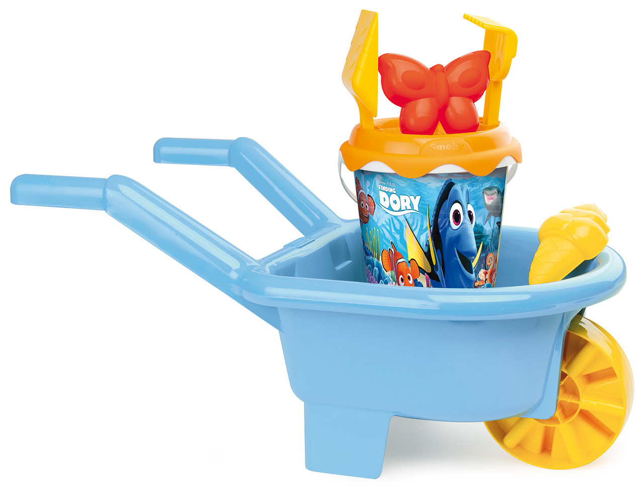 Kolečko s příslušenstvím na písek obsahuje střední kyblíček s obrázkem rybky Dory a jejích kamarádů, lopatičku, hrabičky, 2 formičky a sítko. Průměr kyblíčku cca 16 cm. Rozměry kolečka: 64 x 32 x 30 cm.