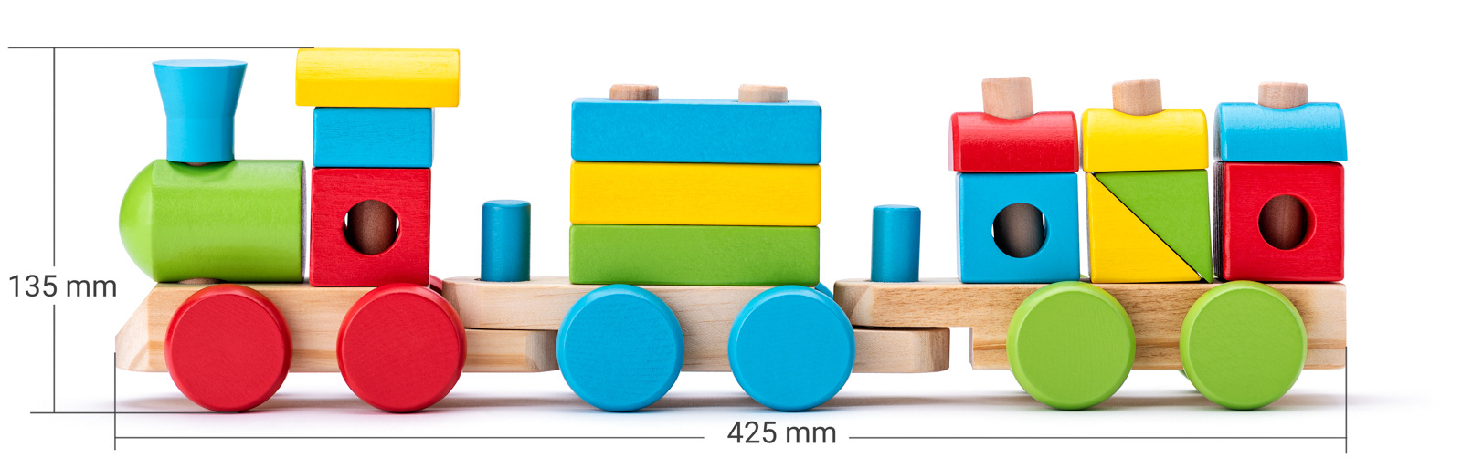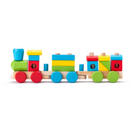 Skládací nákladní vlak obsahuje tyčky, na které je možno navlékat barevné kostky. Vlak je možno rozložit a použít jako stavebnici. Při skládání podporuje rozvoj logiky, jemné motoriky a kombinatoriky. | Věk: 2+| Délka: 43 cm | Počet ks: 18