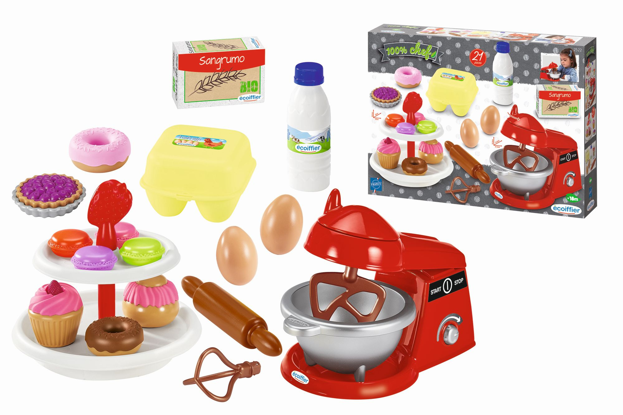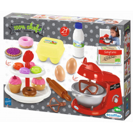 Sada obsahuje kuchyňského robota s mechanickou funkcí, se 2 míchacími nástavci a s mixovací miskou, stojan s moučníky, 2 vejce, váleček, různá prázdná balení potravin, makronky, koláčky, vdolky a koblihy. Celkem 21 doplňků. Rozměry produktu (DxŠxV): 70 x 25 x 20,5 cm.