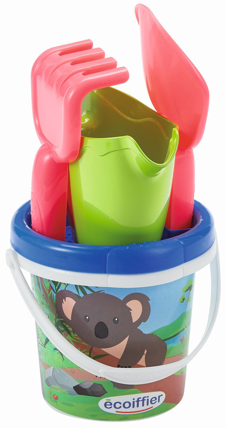 Set na písek s motivem medvídka koaly. Obsahuje kyblíček, sítko, hrabičky, lopatičku a konvičku. Průměr kyblíčku 12 cm, výška kyblíčku 15 cm.