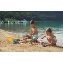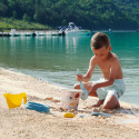 Set na písek s mořským motivem. Obsahuje kyblíček, sítko, hrabičky, lopatičku, konvičku a formičku.