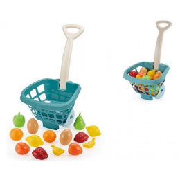 Nakupní košík naplněný různými druhy ovoce a zeleniny. Nákupní košík je díky dvěma kolům a nízké hmotnosti snadno ovladatelný a vhodný pro děti od 18 měsíců. Rozměry produktu 24,5x18,5x41 cm.