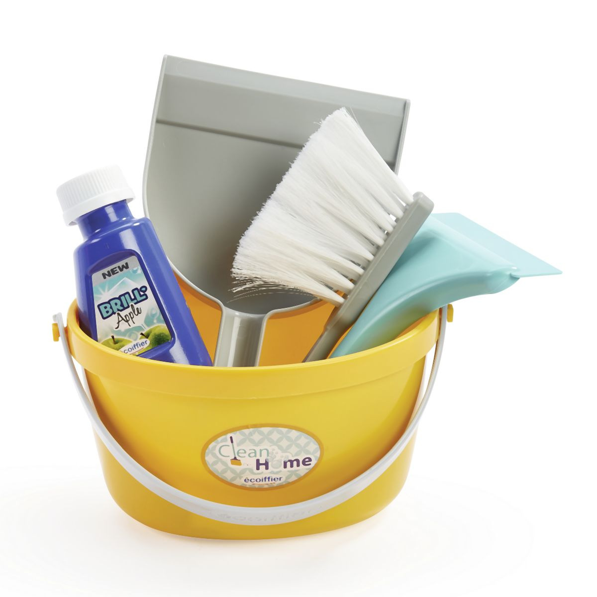 Sada na úklid obsahuje kyblík, smetáček a lopatku, stěrku na sklo a maketu čistícího prostředku.