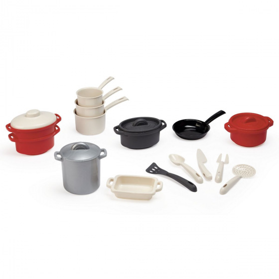 Velká průhledná taška se zipovým zavíráním obsahuje čtyři talíře, sadu čtyř příborů, čtyři pohárky, čtyři plastové hrníčky s podšálky, konvičku, cukřenku, síto a hrnec s pokličkou. Vše plastové. Vhodné pro děti od 18 měsíců. Velikost tašky 29x12x30 cm.