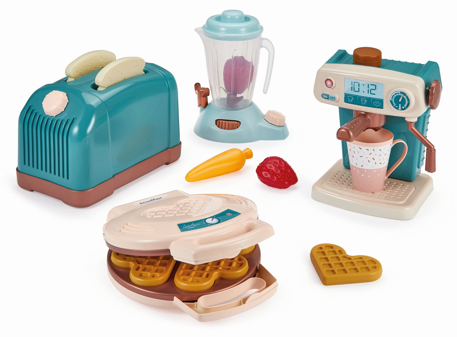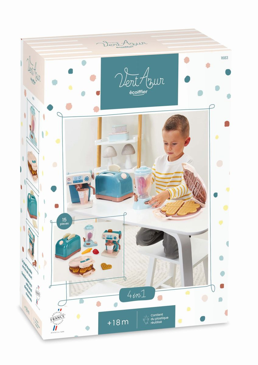 Sada spotřebičů pro přípravu dokonalé snídaně obsahuje toaster, mixér, kávovar a vaflovač. Rozměry toaster: 21,5 x 14 x 13 cm, mixér 15,5 x 19,5 x 11 cm, kávovar 15 x 17,5 x 13 cm a vaflovač 21 x 17 x 5 cm.
