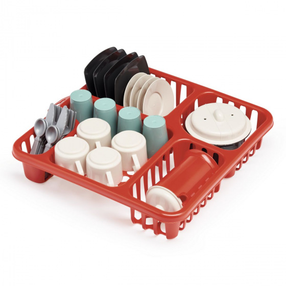 Velká sada nádobí s odkapávačem obsahuje hrníčky, příbory, talíře, hrnec s poklicí, konvičku s poklicí a šálky s podšálky. Rozměry odkapávače 29,5 x 10 x 29 cm. Věk: 18M+
