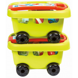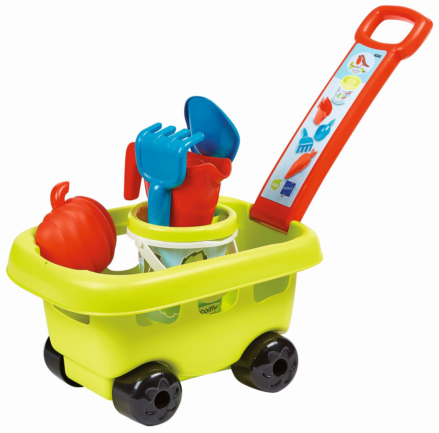 Ruční zahradní vozík s příslušenstvím v kyblíčku. S kyblíčkem na písek, sítem, konvičkou, lopatkou, hrabičkami a formičkou na písek. Vozík se snadno ovládá díky praktickému táhlu. Rozměry produktu (DxŠxV): 31 x 19 x 17,5 cm.