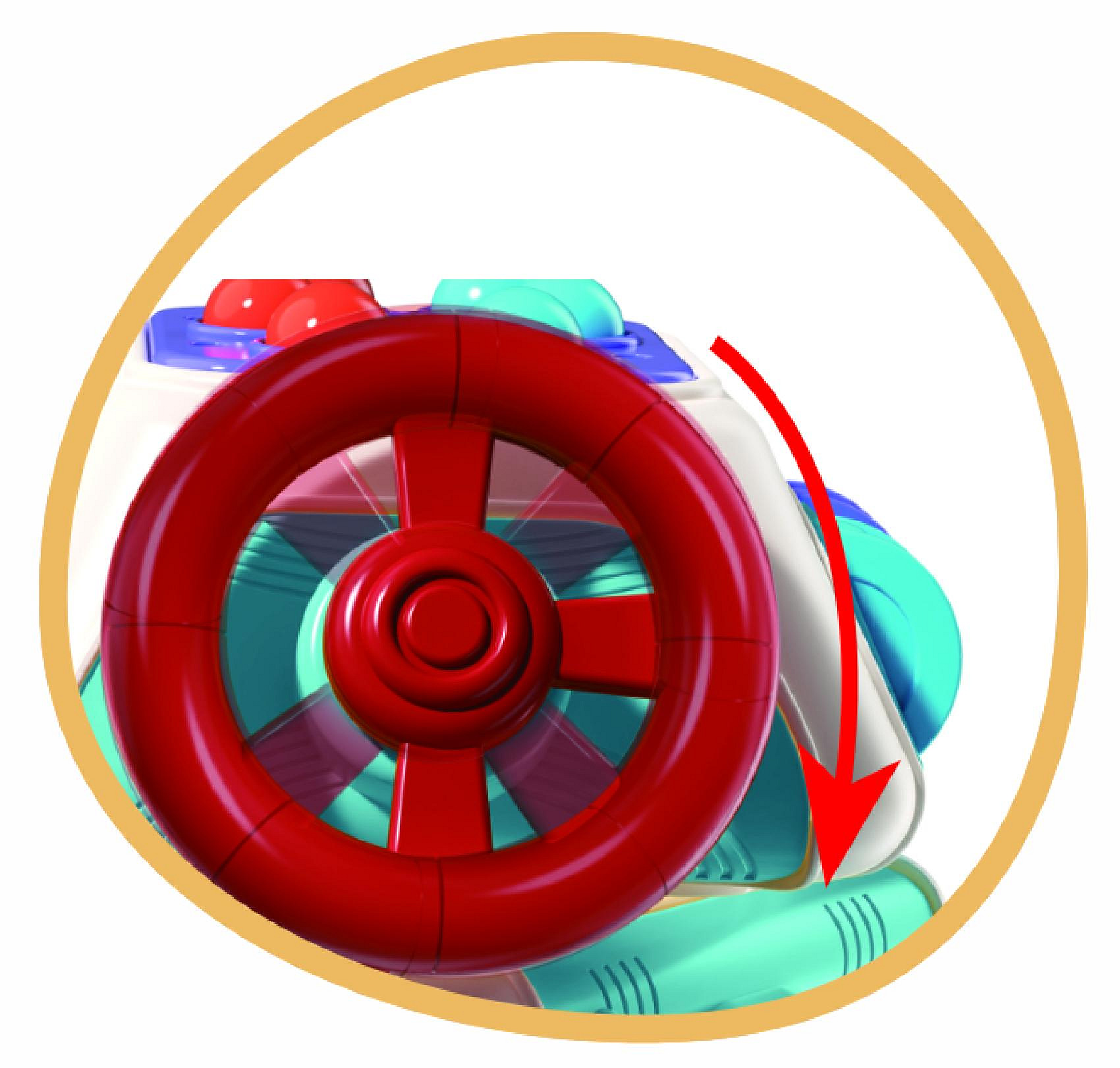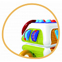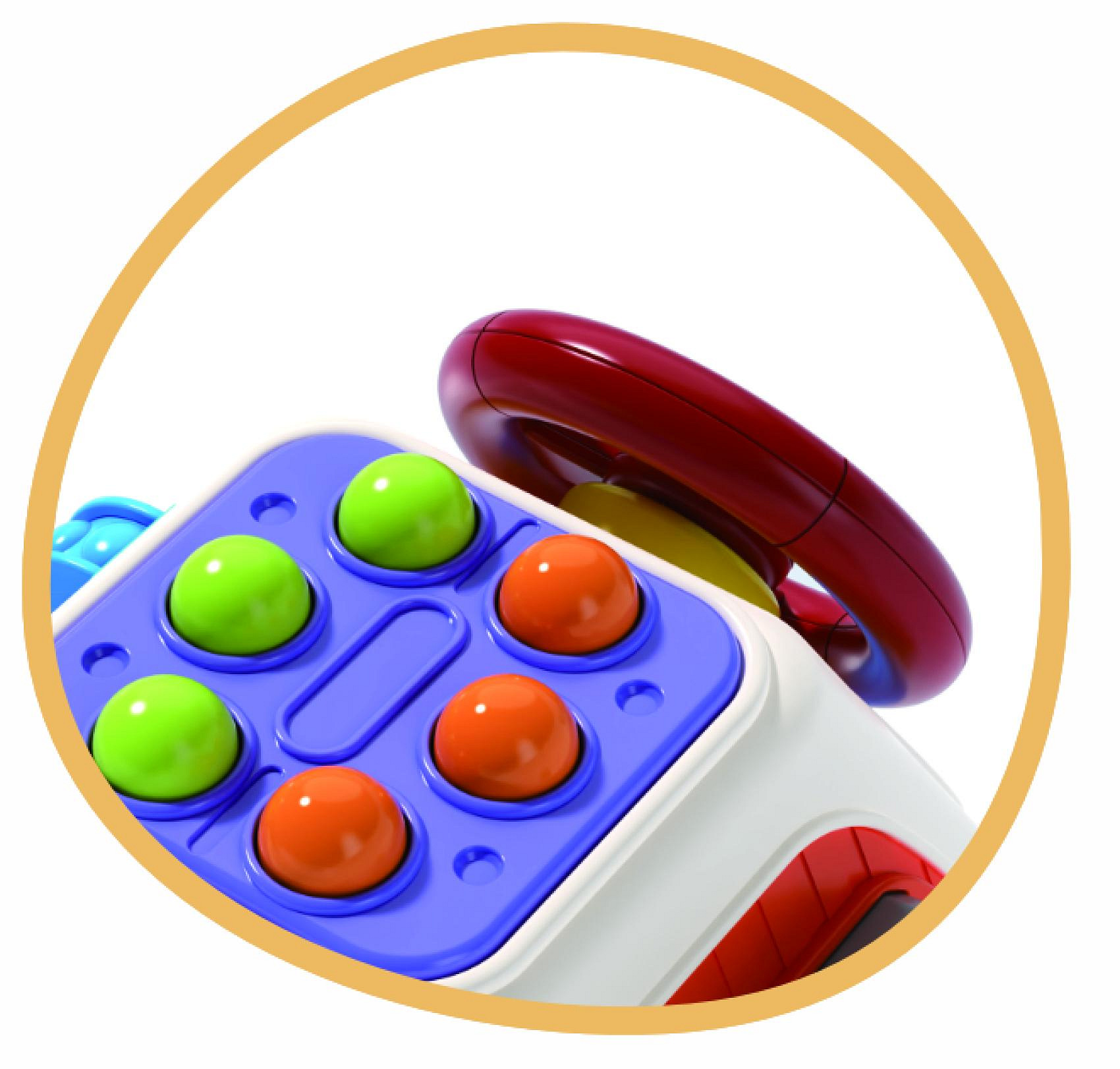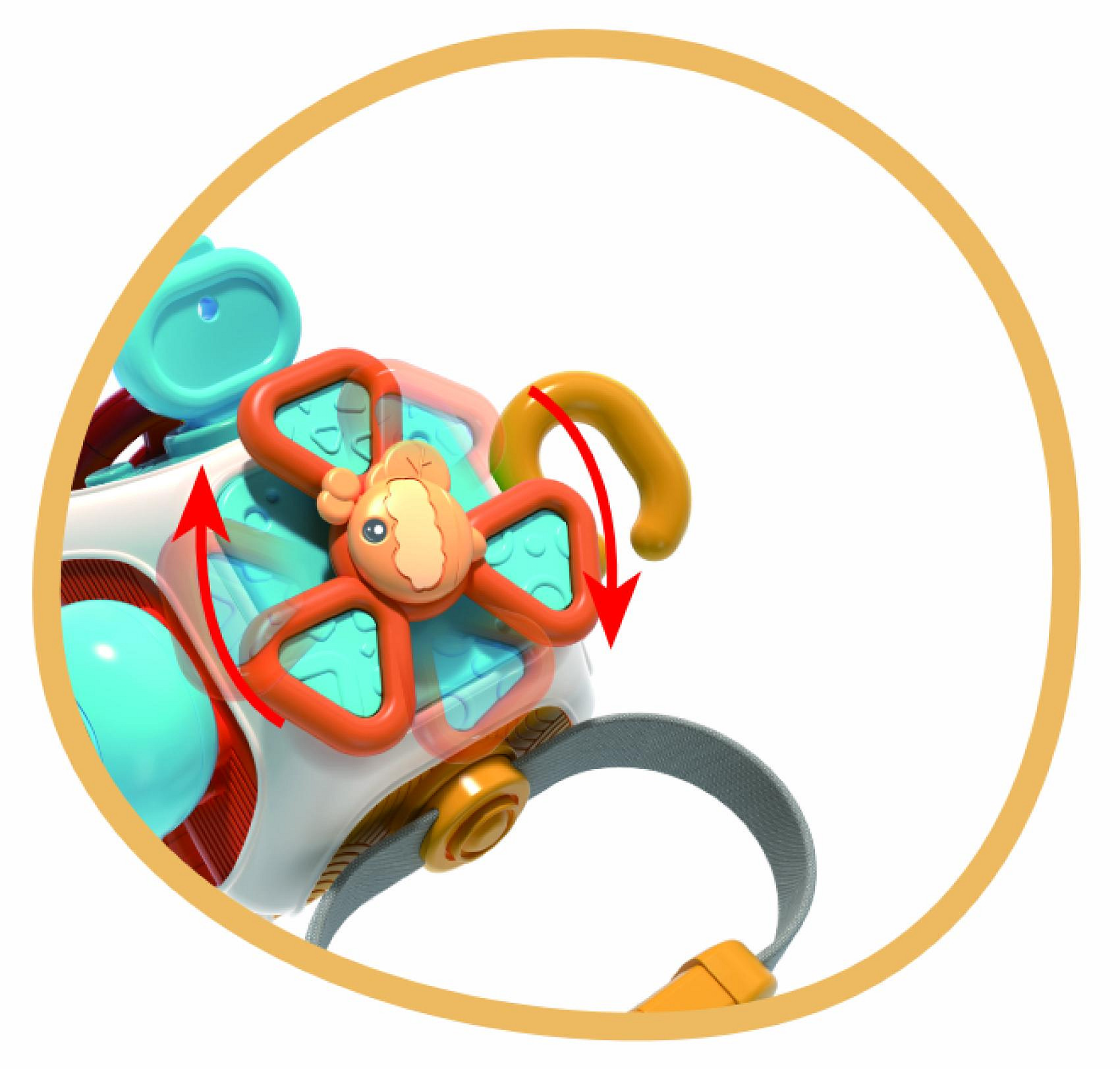 Barevná multifunkční kostka, která zabaví i podpoří správný rozvoj děťátka. Edukáček nabízí na každé straně jinou aktivitu – děti mohou mačkat, otáčet, posouvat i objevovat různé textury a tvary. Horní část zdobí vrtulka, kterou lze otáčet, a každá strana kostky přináší nové překvapení. Díky praktickým úchytům na hračce se dobře manipuluje malými dětskými ručičkami. Certifikováno v ČR.