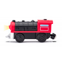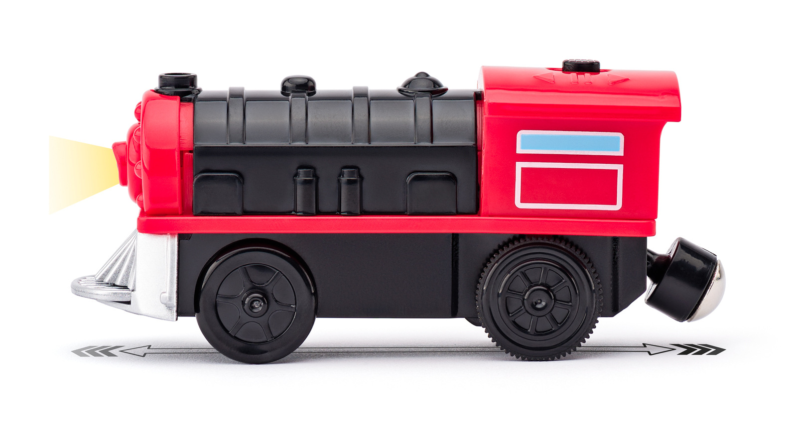 Elektrická mašinka se světlem a zpátečkou. Při nárazu se aktivuje mechanismus, který ji zastaví. Ideální doplněk k vláčkodráhám. | Baterie: 2x1,5V "AAA", není součástí balení| Rozměr výrobku: 11 x 3,5 x 5 cm| Rozteč kol 2,5cm.| Věk: 3+