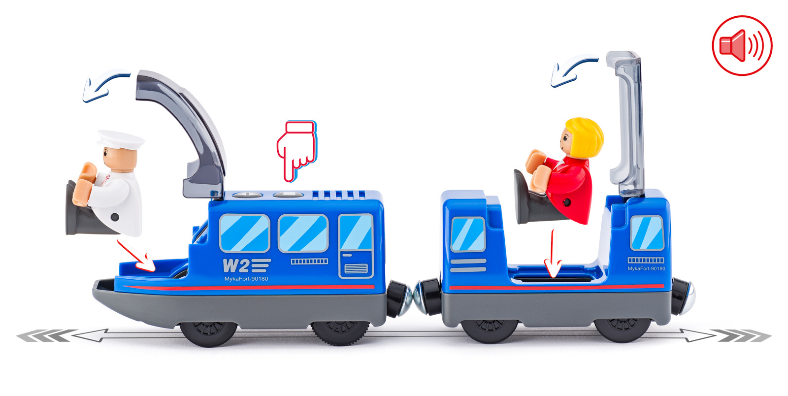 Přepínač lokomotivy s předním a zadním pohonem je umístěný na její střeše. Součástí tohoto výrobku je i strojvedoucí umístěný v kabině lokomotivy. Lokomotiva je kompatibilní se všemi našimi i ostatními vláčkodráhami dostupnými na našem trhu. Jednotlivé vagony se dají spojit magnetem. Věk: 3+ | Rozměr: 10 x 4,5 cm