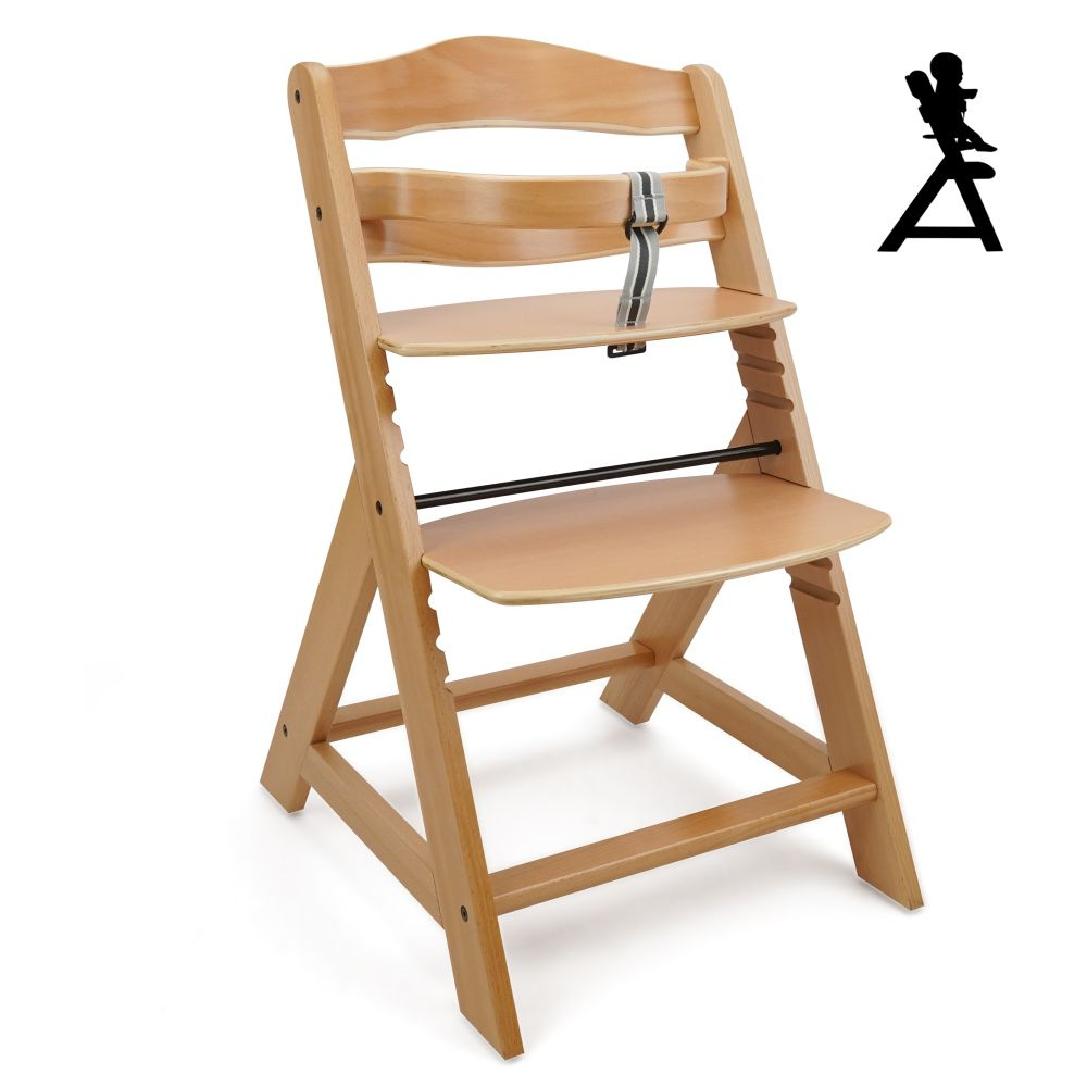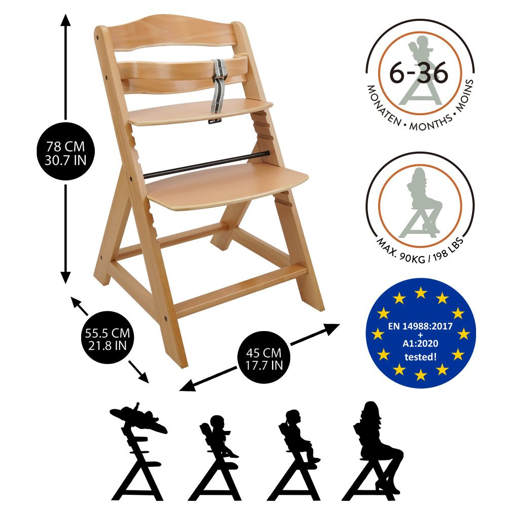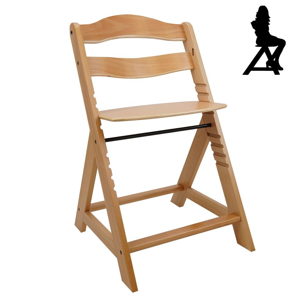 Dřevěná vysoká židlička, která roste spolu s dítětem. Včetně přední tyče a rozdělení rozkroku – u starších dětí lze sejmout a předělat na normální židli i pro dospělé. Vícestupňové nastavení výšky sedáku i opěrky nohou. Opěrku nohou je možné úplně demontovat. Ideální pro krmení, hraní a první domácí úkoly u psacího stolu. Doporučený věk: pro děti od 6 měsíců. Maximální nosnost 90 kg. Produkt vyhovuje normě EN14988. Vyrobeno z kvalitního německého bukového dřeva.