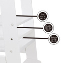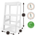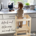 1. Věž je vyrobena z vysoce kvalitní překližky. Maximální nosnost do 50 kg. 2. U plošiny jsou možné 3 výškové úpravy, aby vyhovovaly výšce dítěte: 34, 40,5 nebo 47 cm 3. Dítě může vylézt na výukovou věž samostatně, schod od podlahy je ve výšce 20 cm, což pomáhá dítěti dostat se na věž bezpečně. 4. Navrženo pro většinu kuchyňských linek nebo koupelnových umyvadel. 5. Dřevěný materiál byl testován a neobsahuje formaldehyd. 6. Vhodné pro děti ve věku 18 - 48 měsíců.