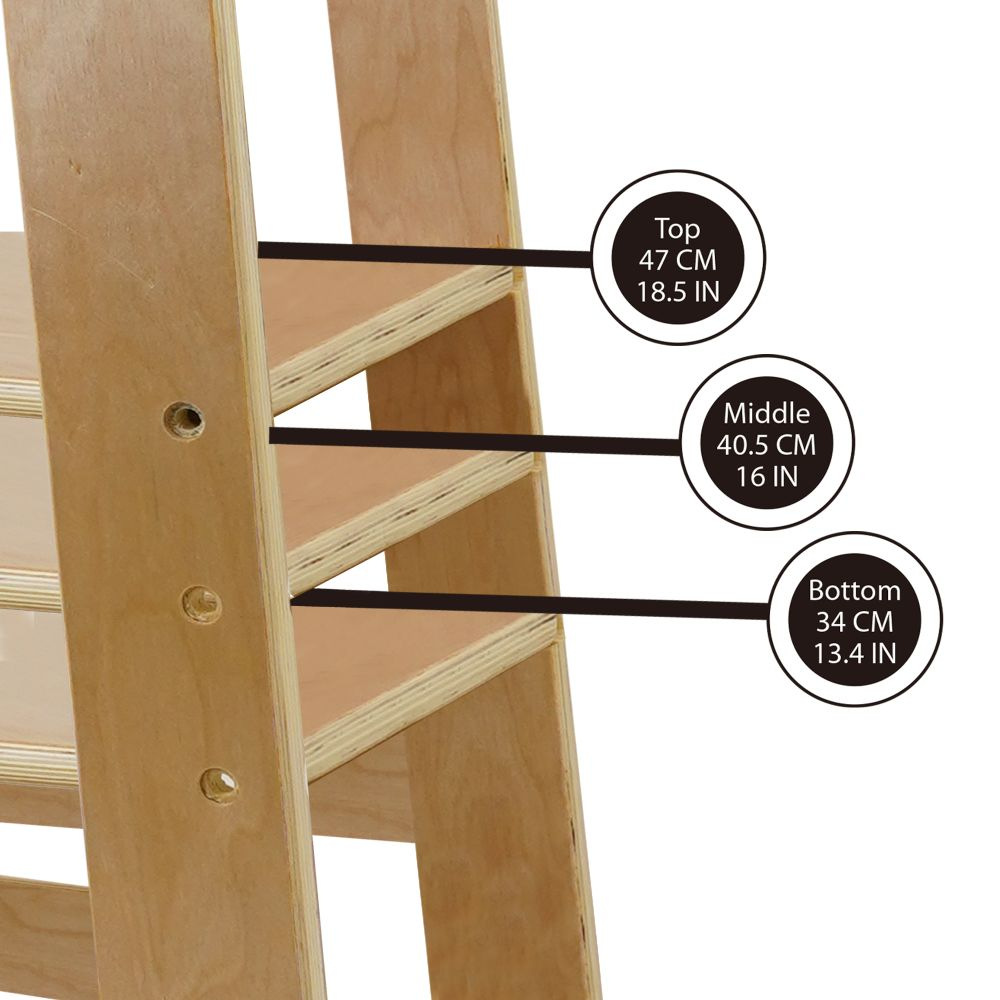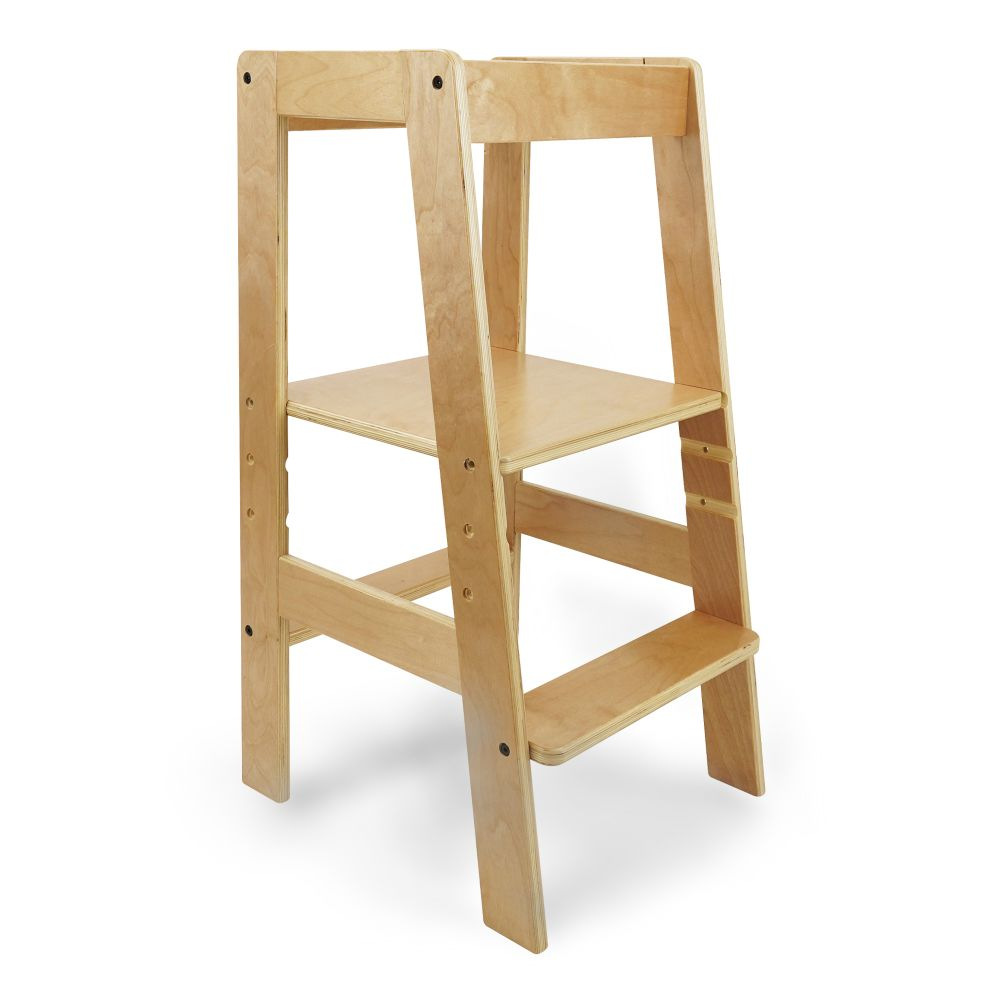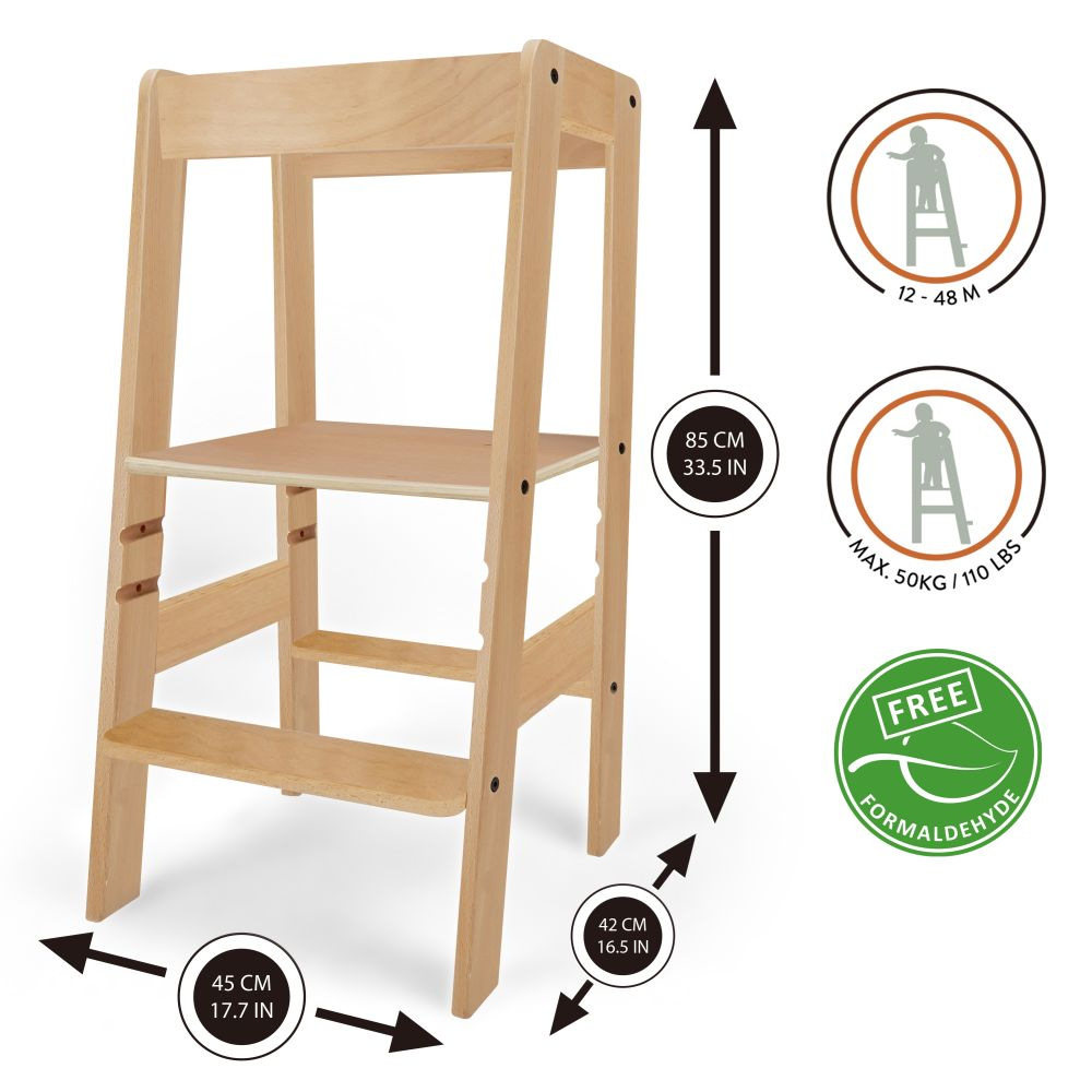 1. Věž je vyrobena z vysoce kvalitní překližky. Maximální nosnost do 50 kg. 2. U plošiny jsou možné 3 výškové úpravy, aby vyhovovaly výšce dítěte: 34, 40,5 nebo 47 cm 3. Dítě může vylézt na výukovou věž samostatně, schod od podlahy je ve výšce 20 cm, což pomáhá dítěti dostat se na věž bezpečně. 4. Navrženo pro většinu kuchyňských linek nebo koupelnových umyvadel. 5. Dřevěný materiál byl testován a neobsahuje formaldehyd. 6. Vhodné pro děti ve věku 18 - 48 měsíců.